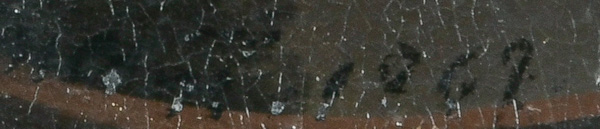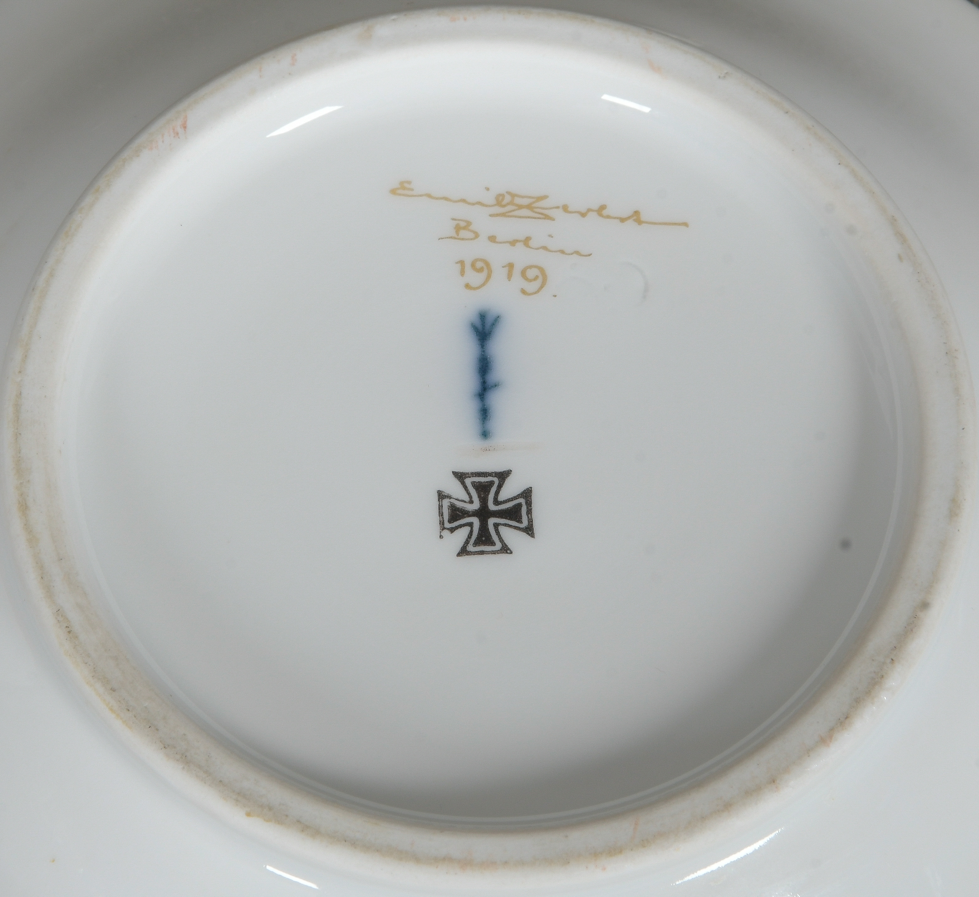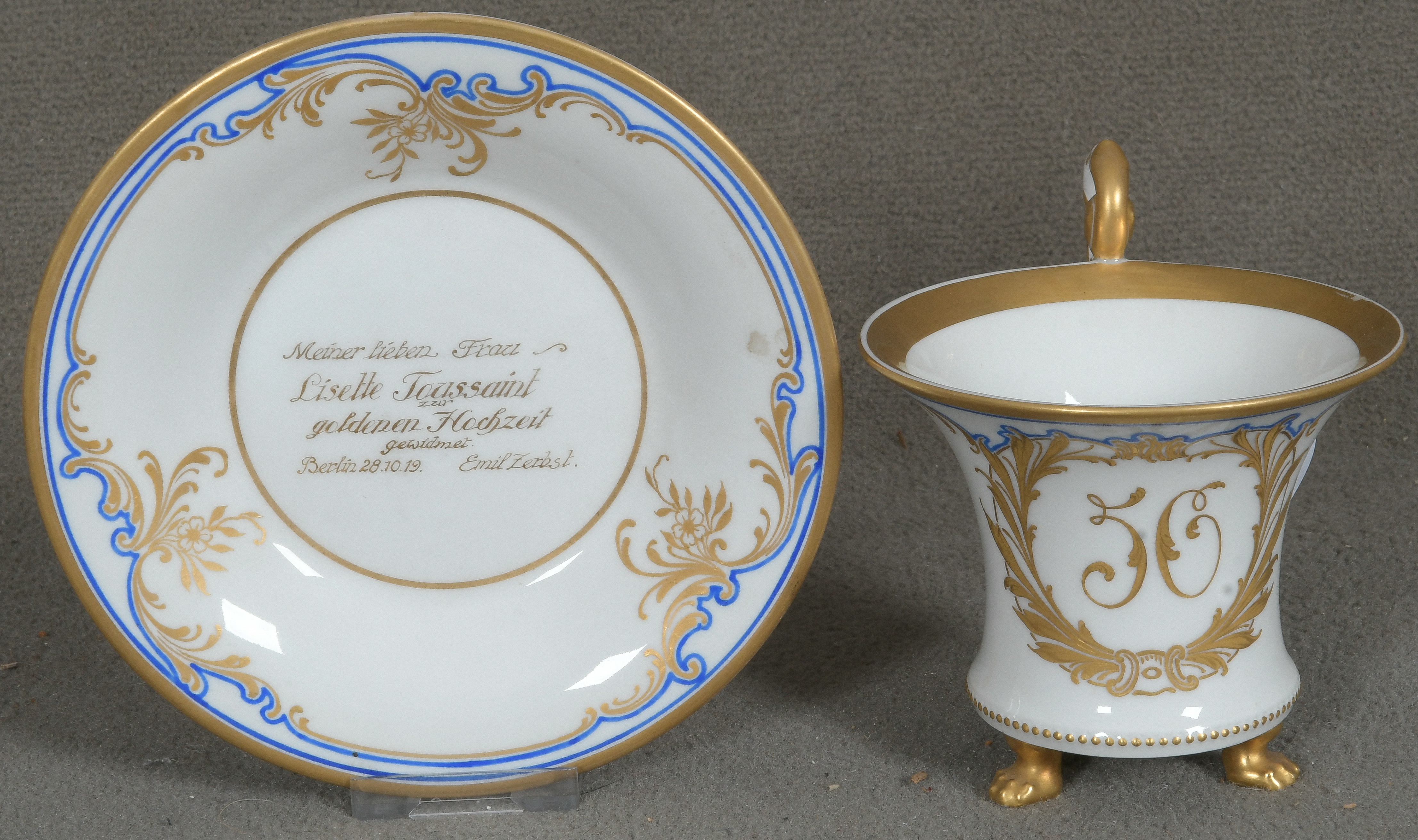- Katalog-Nr: 1918Gedenktasse mit Unterschale. Berlin 1919. Porzellan, bunt bemalt, gold gehöht; und beschriftet: „Meiner lieben Frau Lisette Toussaint zur goldenen Hochzeit gewidmet Berlin 28.10.19 Emil Zerbst“; am Boden unterglasurblaue Szeptermarke mit EK.o.L.
