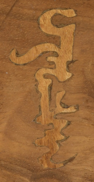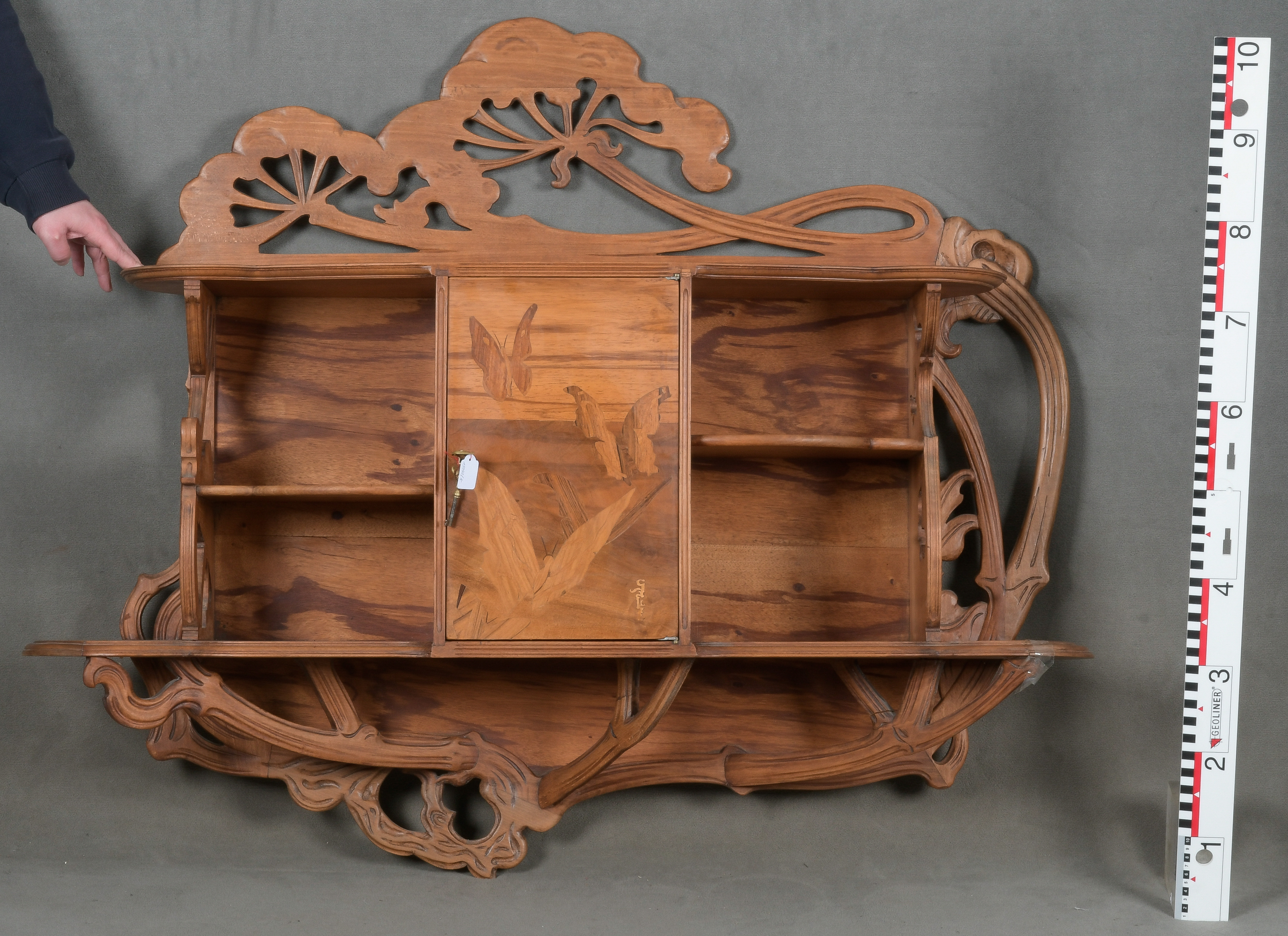 - Katalog-Nr: 1921Jugendstil-Hängeregal. Nancy, Émile Gallé um 1900. Massiv Nussbaum, marketiert mit Schmetterlingen und Blumen in verschiedenen Hölzern; geschweiftes, durchbrochenes Gestell mit mittiger Tür, flankiert von je zwei offenen Fächern, abgerundete Plattenkante, in der Tür sign., H=102 cm, B=121 cm, T=26 cm.o.L.