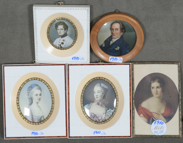 - Katalog-Nr: 1910Miniaturist des 19./20. Jhs. Fünf Damen- bzw. Herrenporträts, hi./Gl. gerahmt, 6 x 5 bis 10 x 8,5 cm.o.L.