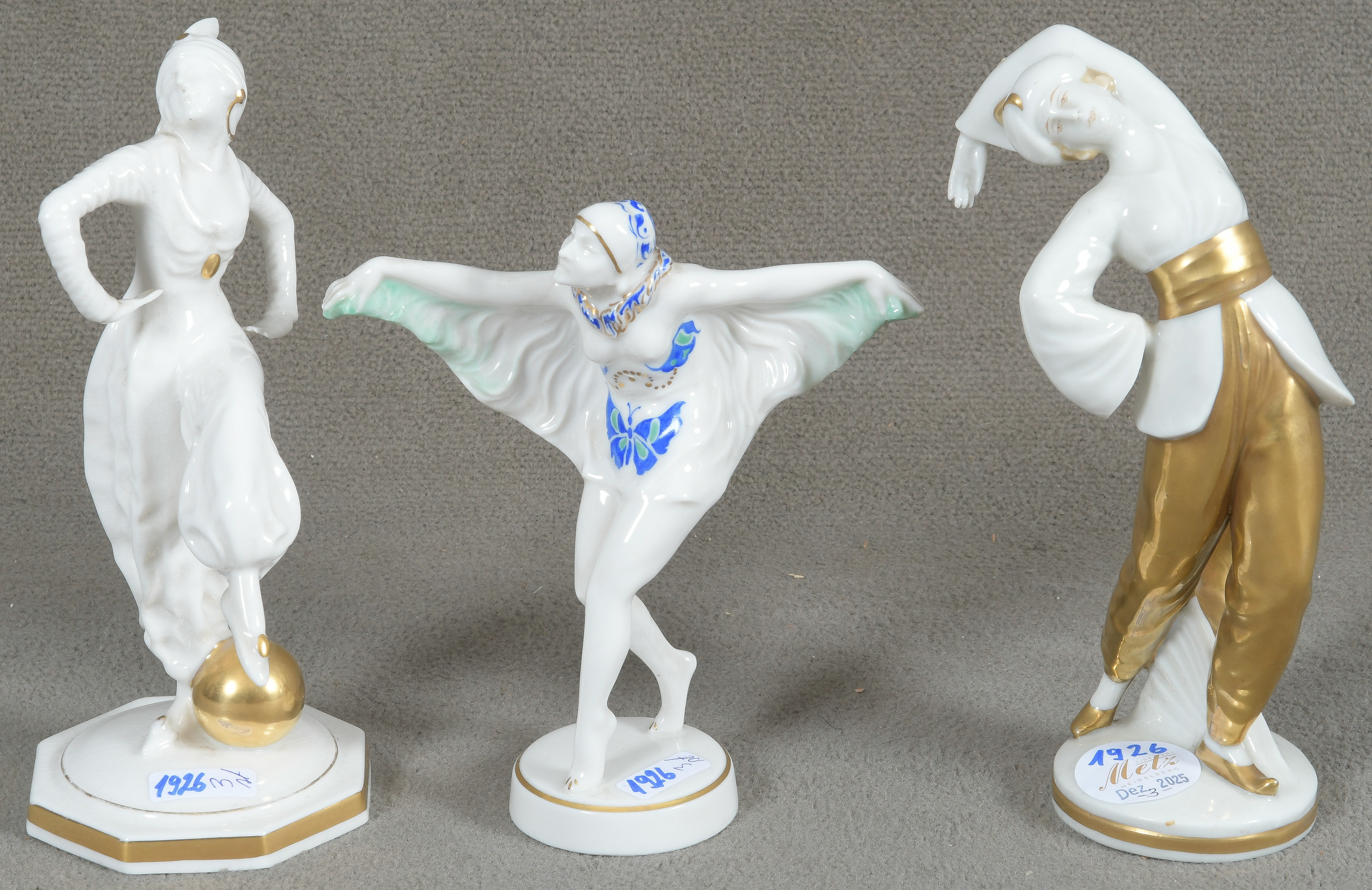 - Katalog-Nr: 1926Drei Tänzerinnen, u.a. Hutschenreuther 20. Jh. Porzellan, teilw. bunt bemalt und gold staffiert; am Boden gemarkt, H=15 bis 19 cm.o.L.