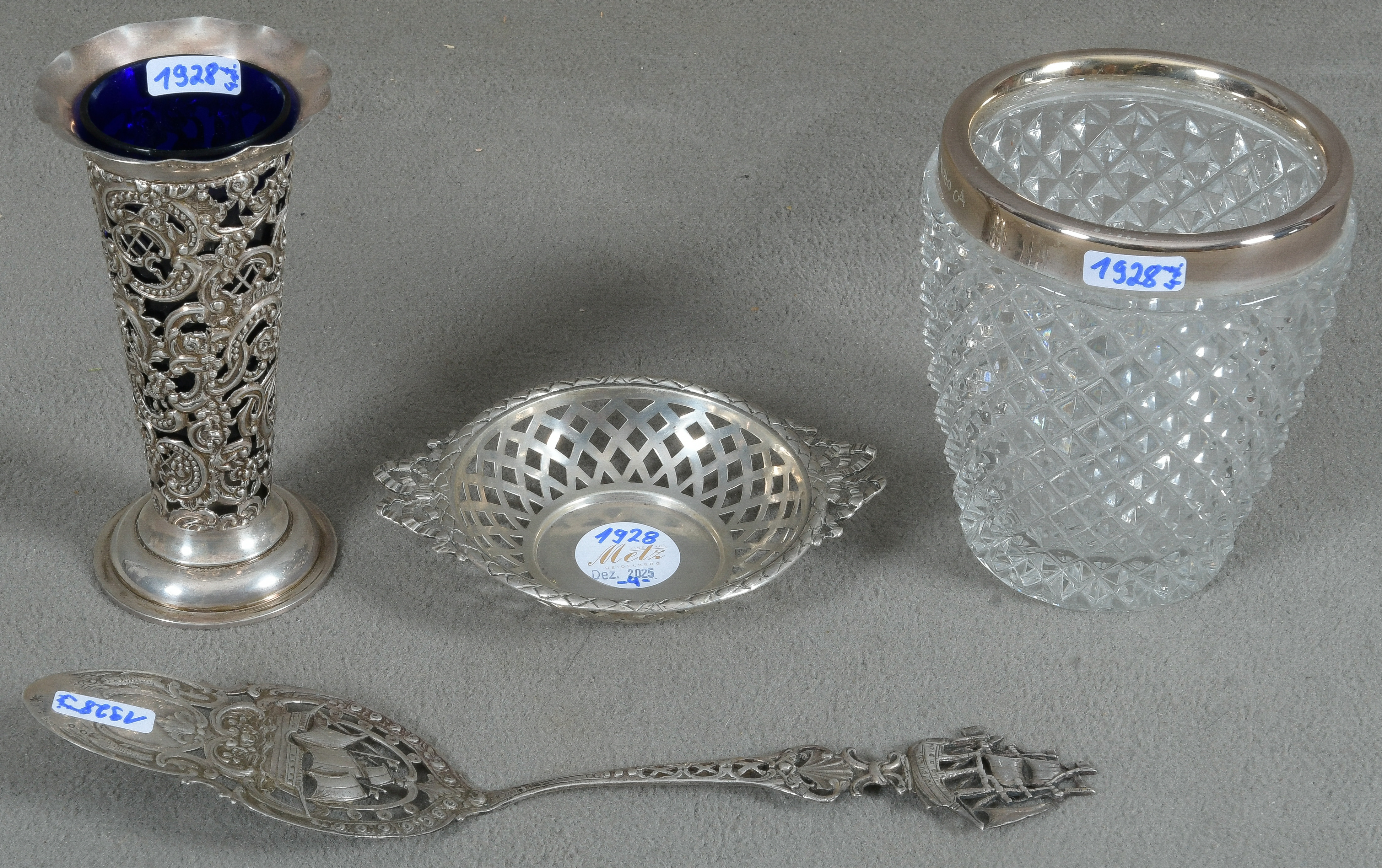 - Katalog-Nr: 1928Viertlgs. Konvolut Silber, ca. 245 g. Deutsch 20. Jh. Bestehend aus: Eine Kuchenschaufel, eine Schale und zwei Vasen, H=3 bis 15 cm.o.L.