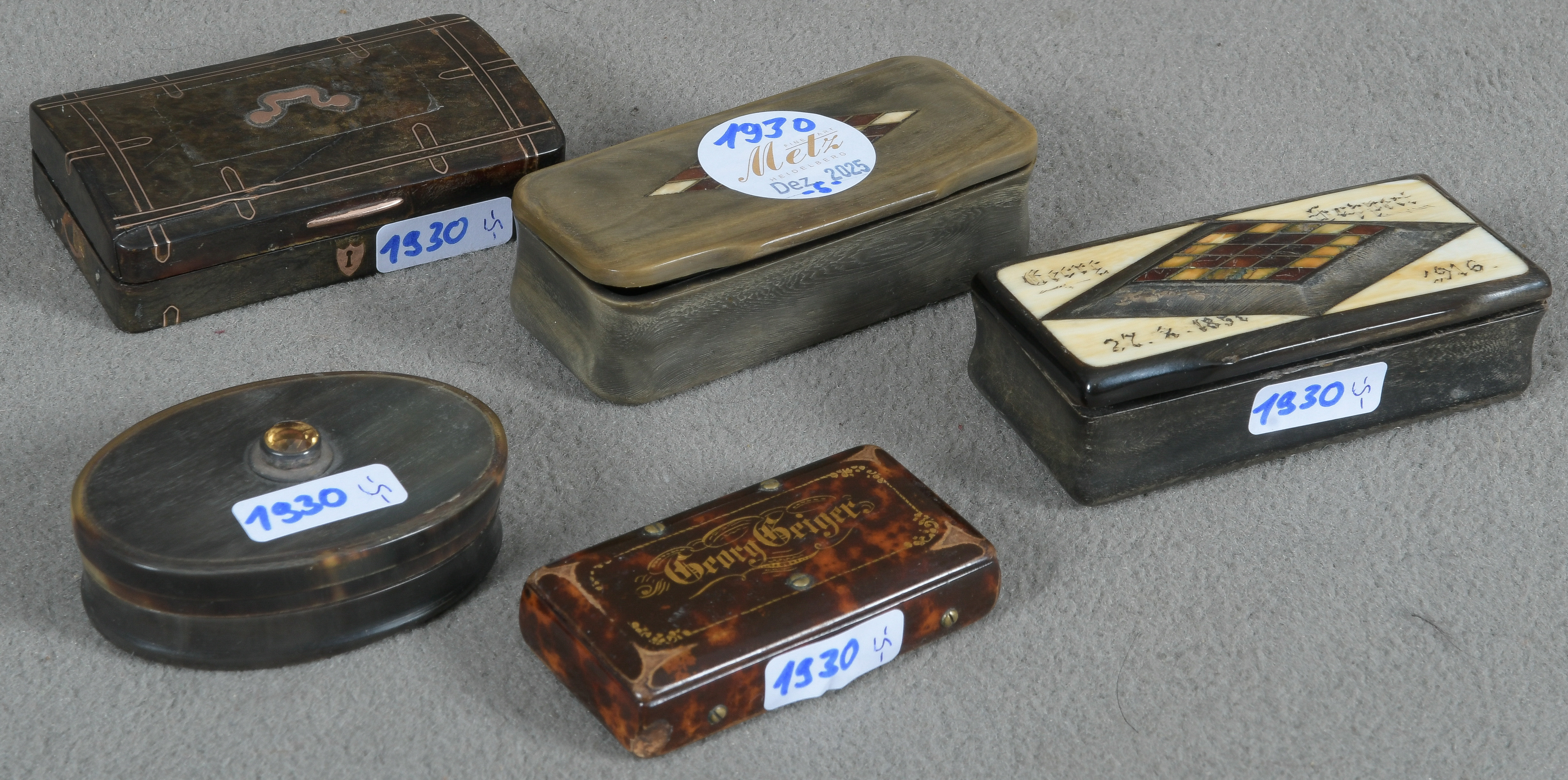 - Katalog-Nr: 1930Fünf Tabatièren. Deutsch 19. Jh. Horn, teilw. intarsiert mit 18 kt Gold und farbigen Steinen, H=1,5 cm, B=6,5 cm, T=3,5 cm bis H=2,5 cm, B=9 cm, T=4 cm.o.L.