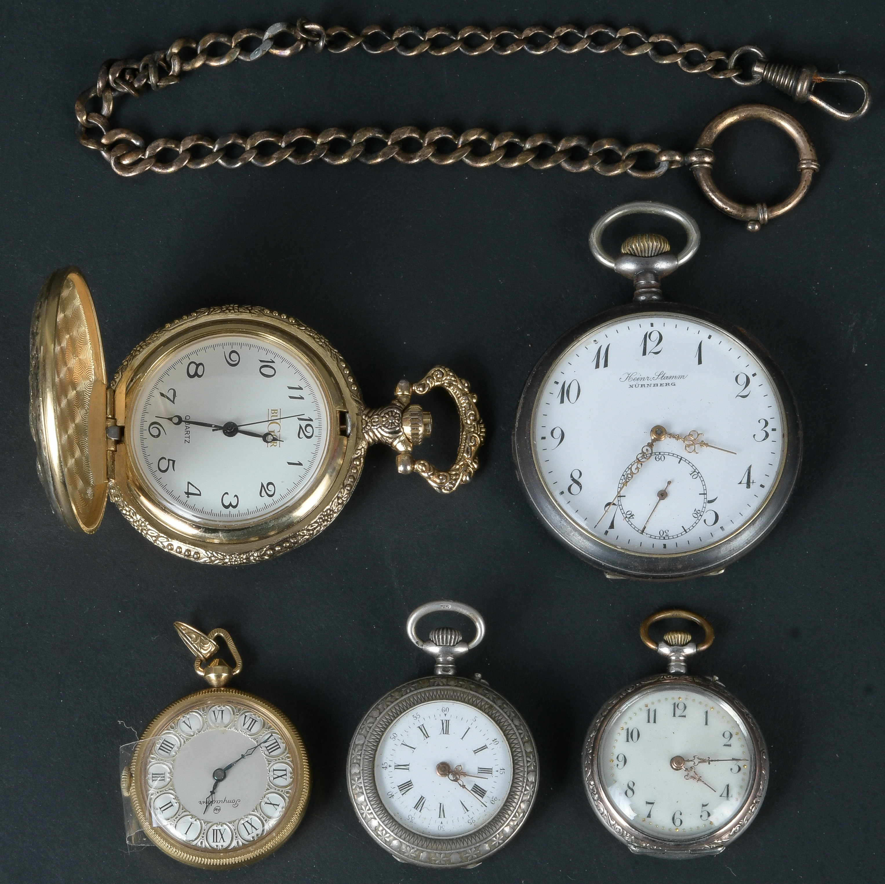 - Katalog-Nr: 1931Fünf Taschenuhren und eine Uhrenkette u.a. „Heinz Stamm“, „Bulgor“, „Pompadour“. Teilw. Silber. (Funktion ungeprüft)o.L.