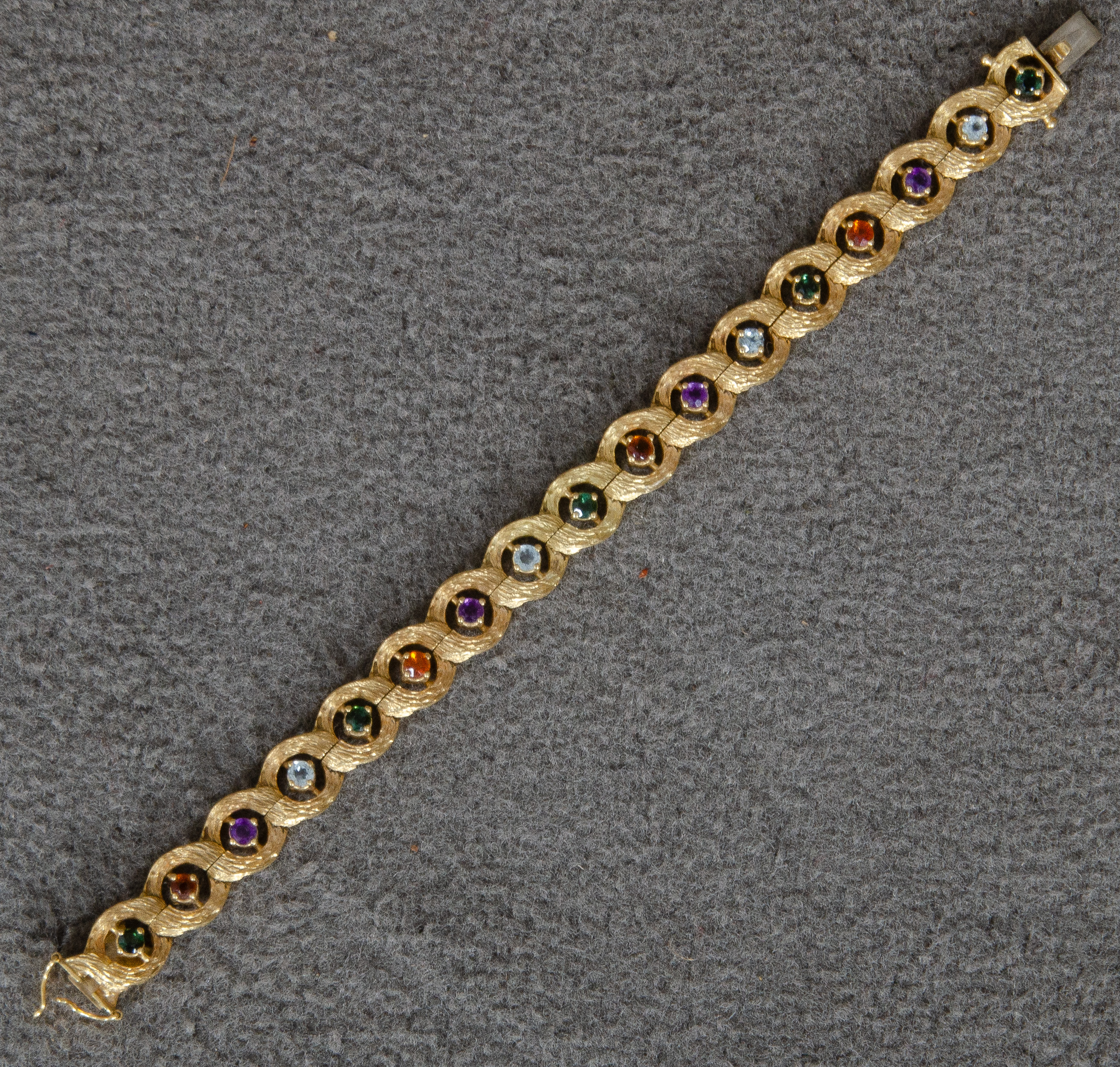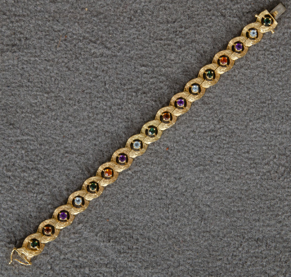 - Katalog-Nr: 1934Gliederarmband. 18 kt Gold, besetzt mit Aquamarin, Saphir und Smaragd, Gesamtgewicht ca. 33,80 g, L=19 cm.o.L.