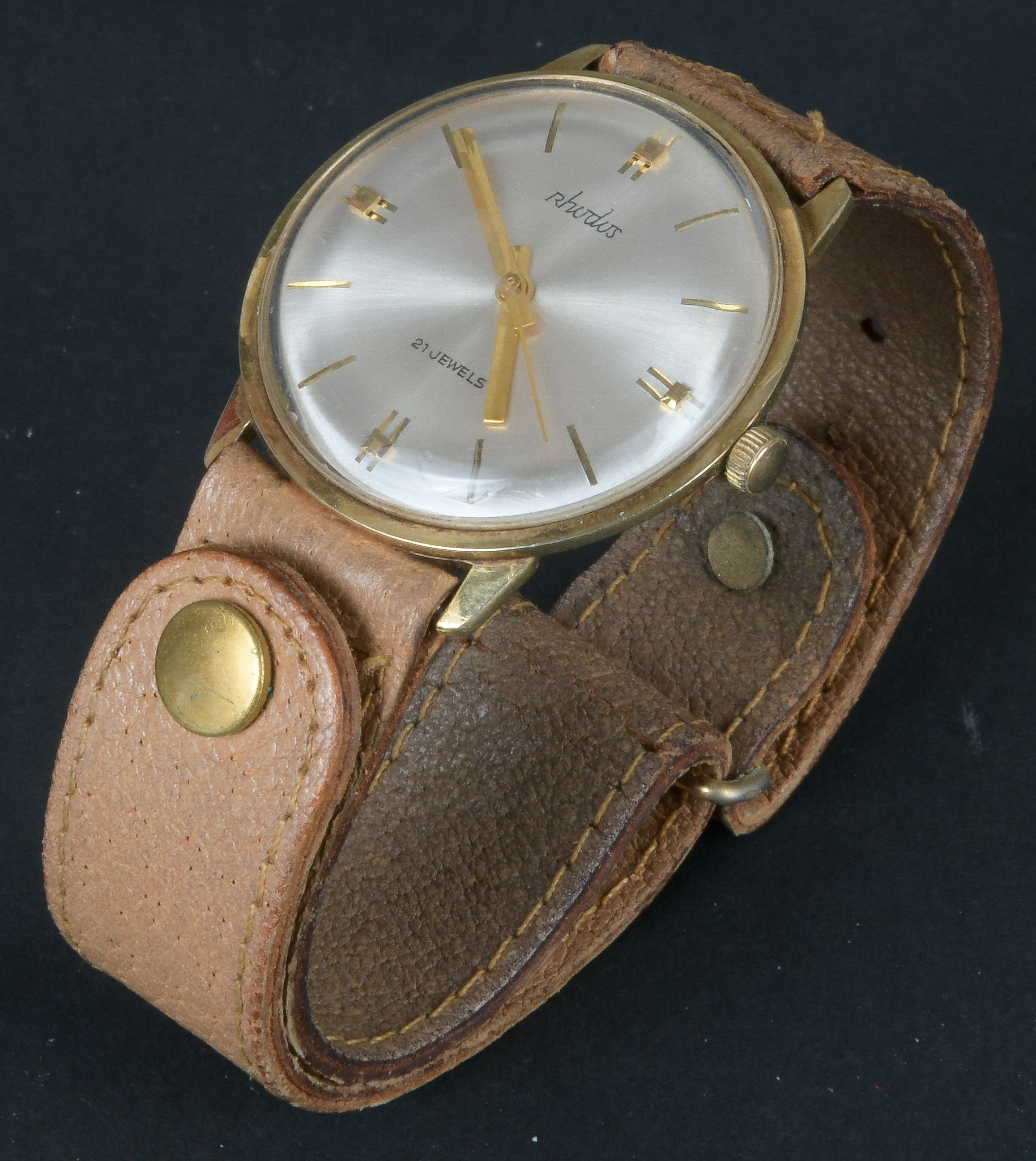 - Katalog-Nr: 1944Herrenarmbanduhr „Rhodos“. 14 kt Goldgehäuse. (Funktion ungeprüft)o.L.