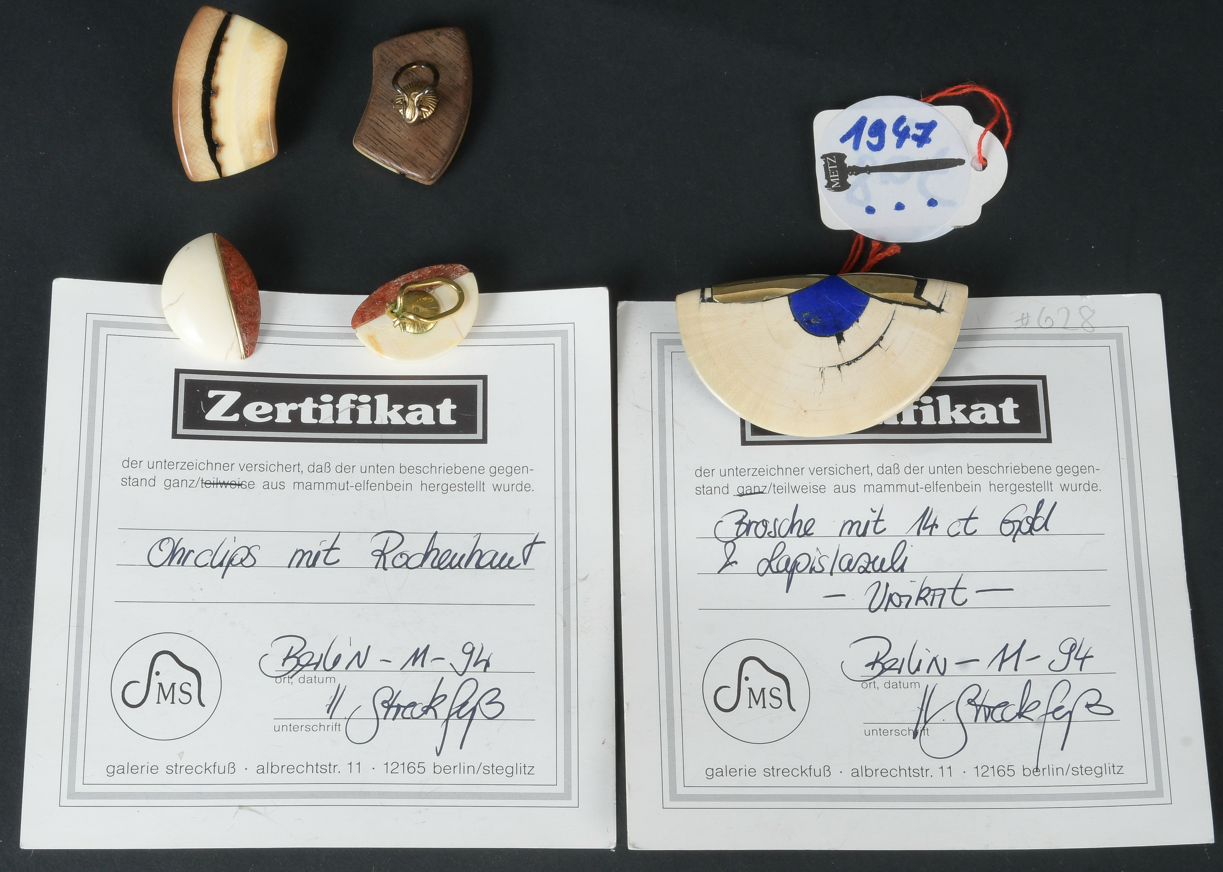 - Katalog-Nr: 1947Brosche und zwei Paar Ohrclips. 14 kt Gold / Silber, besetzt mit Bein. Mit Zertifikat von Matthias Streckfuß.o.L.