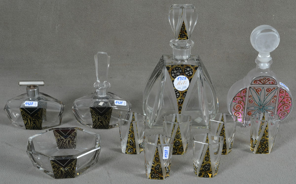 - Katalog-Nr: 1927Konvolut Art Déco-Glas. Frankreich 20. Jh. Teilw. farbig überfangen und geschliffen. Bestehend aus: Karaffen, Likörflasche, Parfumzerstäuber, Schale, Schnapsgläser, H=5 bis 27 cm. (eines best.)o.L.