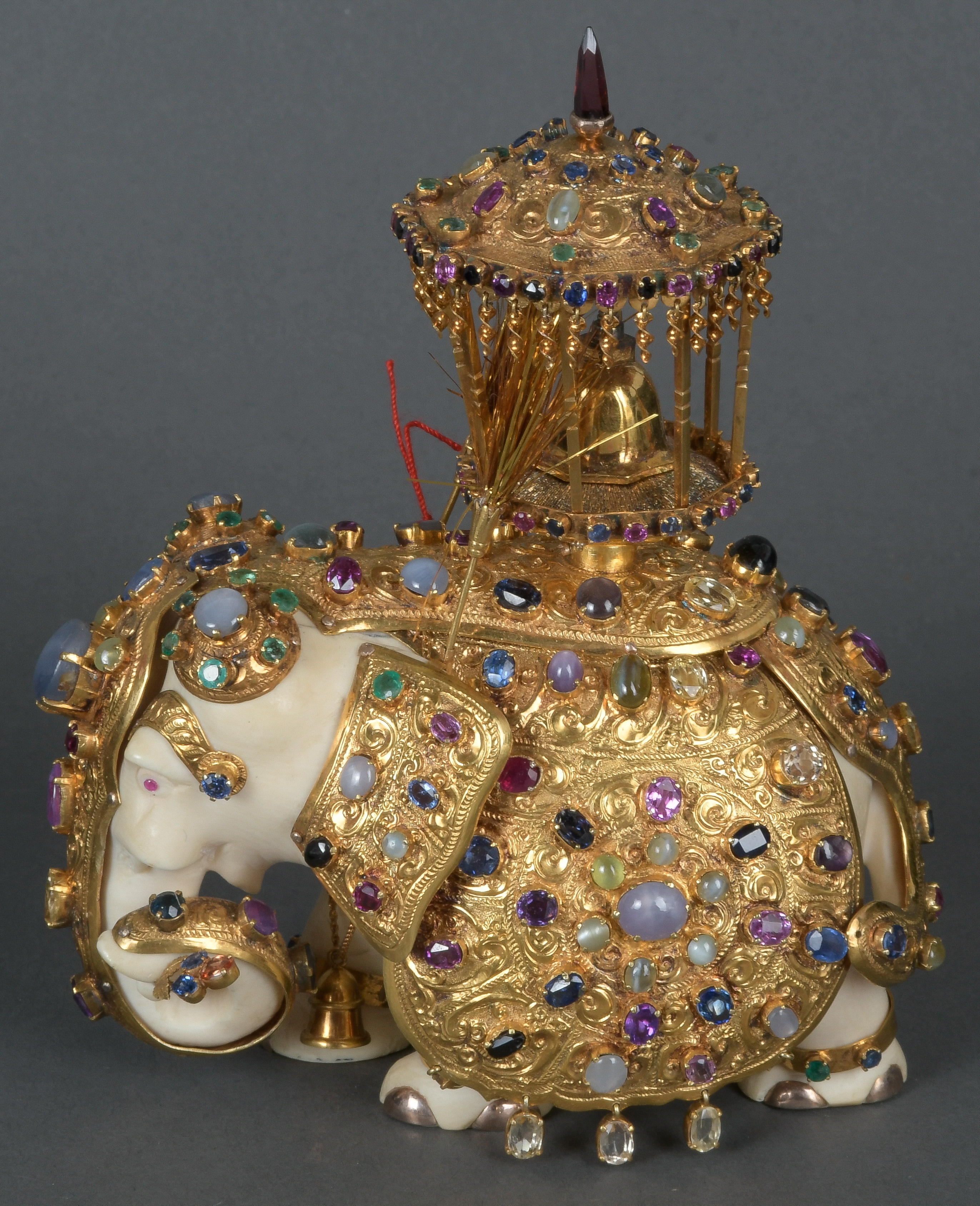 - Katalog-Nr: 1951Prunkelefant im Etui. Wohl Sri Lanka 19. Jh. Meisterhaft geschnitzt, mit 916er Gelbgoldrüstung und Baldachinaufsatz; dieser reich besetzt mit zahlreichen Edel- und Halbedelsteinen wie Achat, Citrin, Mondstein, Saphir, Smaragd, synth. Rubin, Sternsaphir/ -rubin, Quartz-Katzenauge, Topas und Turmalin in unterschiedlichen Schliffen, Gesamtgewicht ca. 373 g, H=12,5 cm, L=13 cm, T=6 cm.o.L.