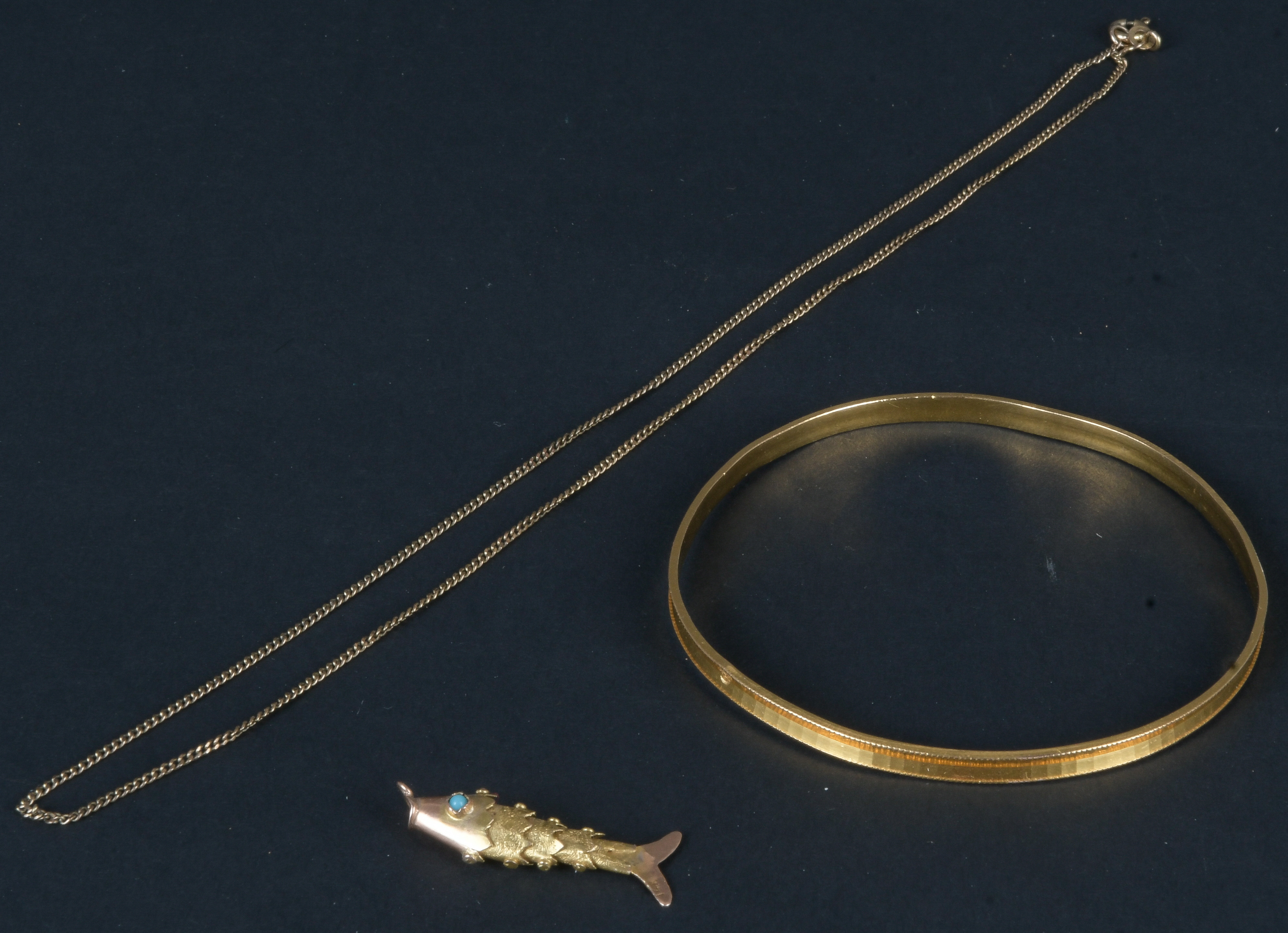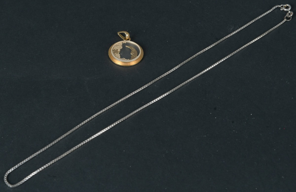 - Katalog-Nr: 1973Halskette mit Anhänger und Armreif. 14 kt Gold, ca. 13,09 g / 8 kt Gold, ca. 2,29 g, L=40 cm.o.L.
