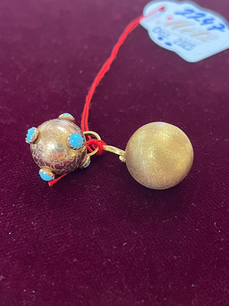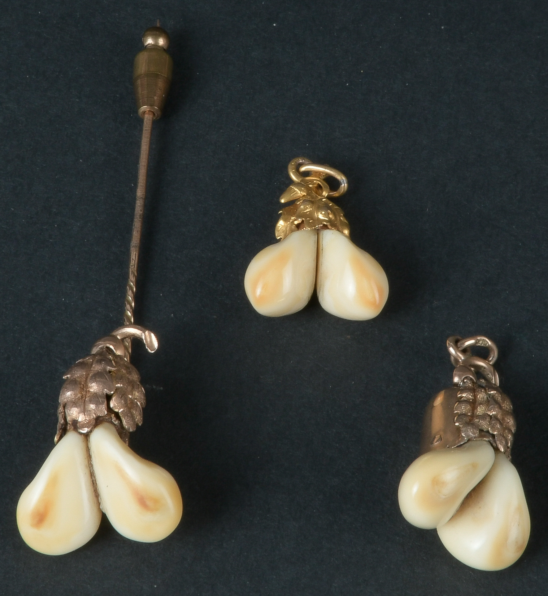 - Katalog-Nr: 2225Anstecknadel und zwei Anhänger. 14 kt Gold, besetzt mit Grandeln, Gesamtgewicht ca. 17,72 g.o.L.