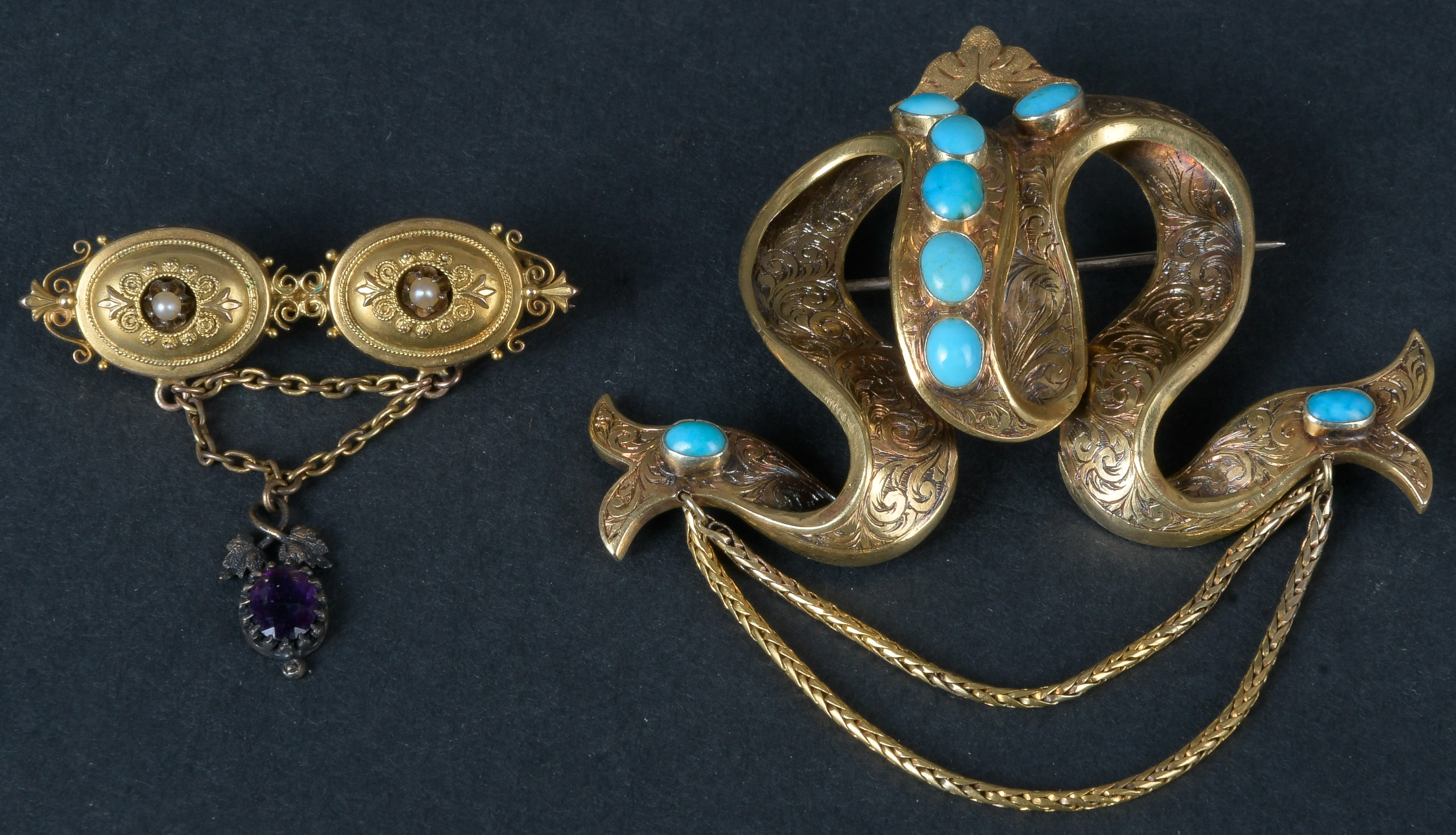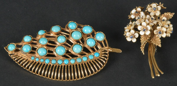 - Katalog-Nr: 2226Zwei Broschen. 14 kt Gold, u.a. besetzt mit Türkisen, Gesamtgewicht ca. 14,16 g.o.L.
