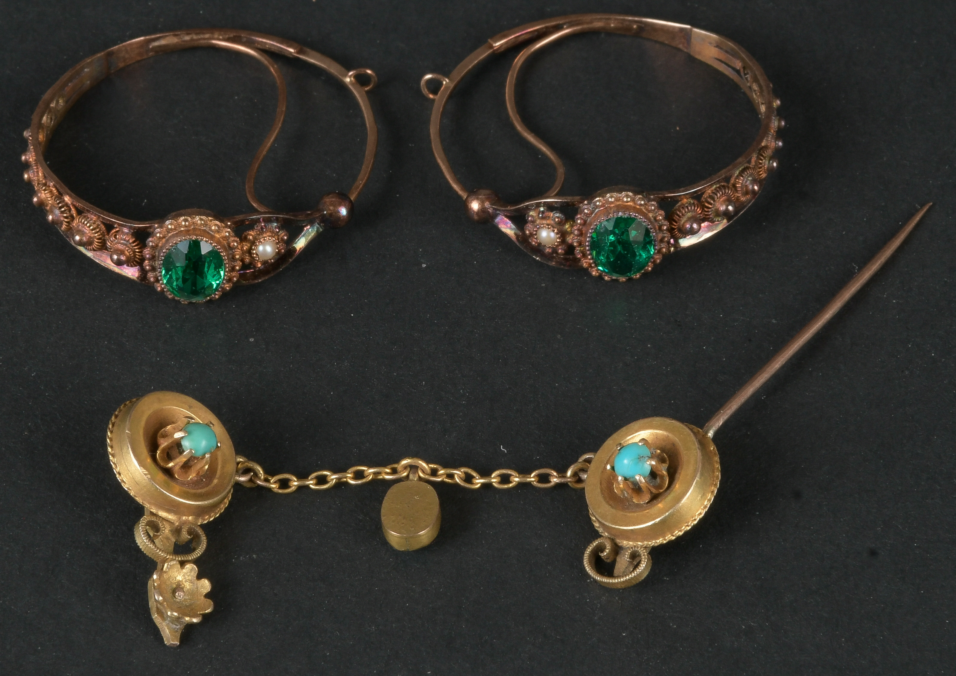- Katalog-Nr: 2227Anstecknadel und ein Paar Ohrstecker. 14 kt Gold, besetzt u.a. mit Türkis, Gesamtgewicht ca. 7,51 g.o.L.
