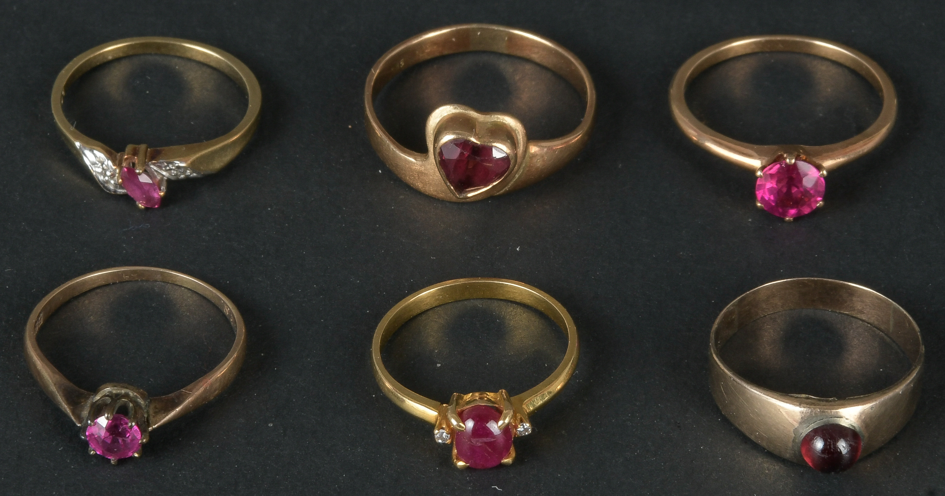 - Katalog-Nr: 2232Sechs Damenringe. 14 kt Gold, teilw. besetzt mit granat- und rubinfarbigem Stein, Gesamtgewicht ca. 13,02 g, Ringgröße 51 bis 61.o.L.