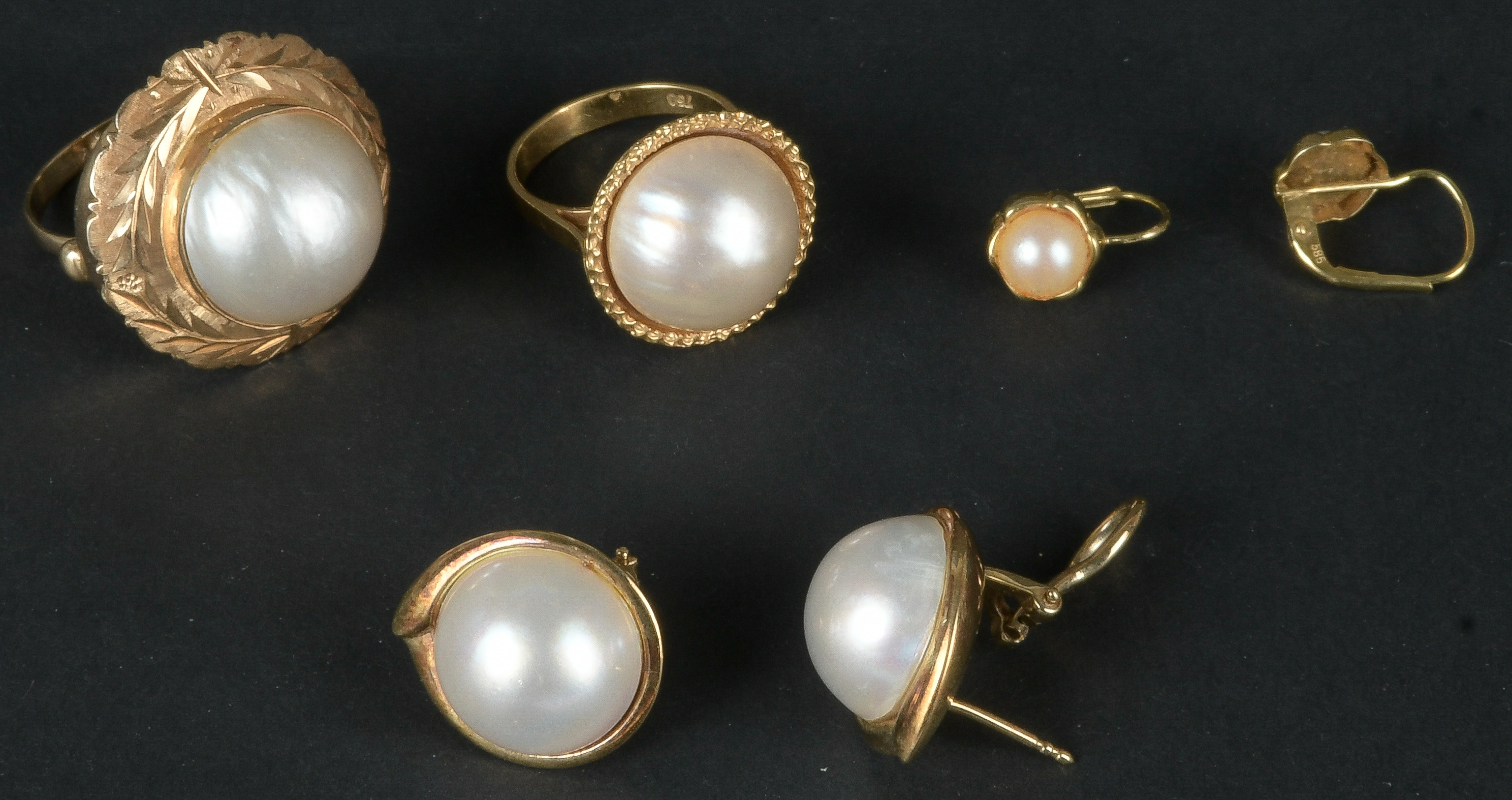 - Katalog-Nr: 2234Zwei Paar Ohrstecker und zwei Damenringe. 14 kt Gold, besetzt mit Perlen, Gesamtgewicht ca. 29,97 g, Ringgröße 49 / 63.o.L.