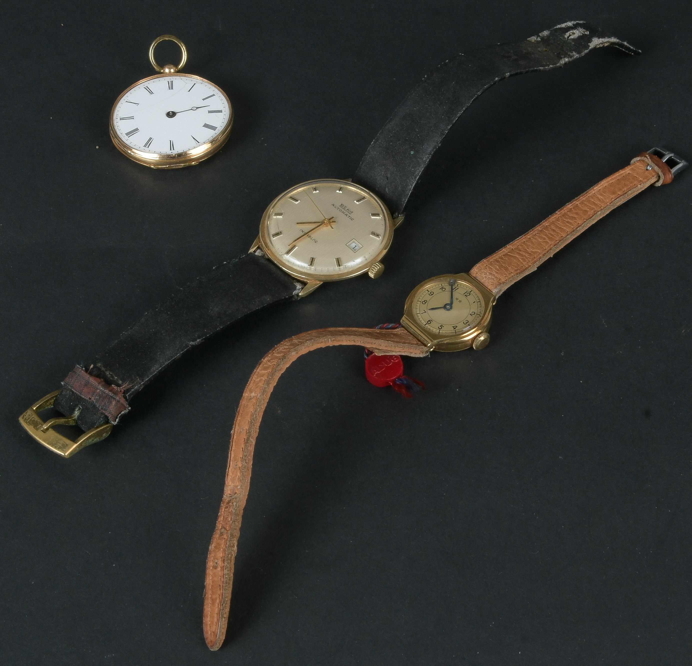 - Katalog-Nr: 2236Zwei Armbanduhren und eine Taschenuhr, u.a. „Beha“. 14 kt Gold. (Funktion ungeprüft / Taschenuhr besch.)o.L.