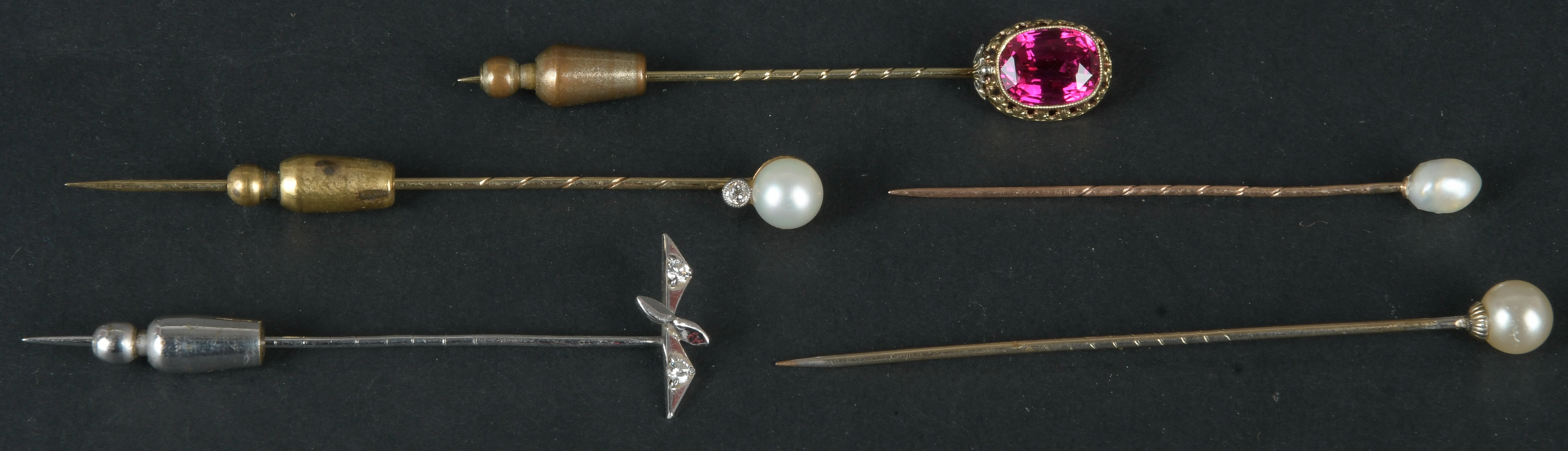 - Katalog-Nr: 2237Fünf Anstecknadeln. 14 kt Gold, besetzt mit Brillant, ca. 0,06 ct, Perlen und rubinfarbigem Stein, Gesamtgewicht ca. 6,13 g.o.L.