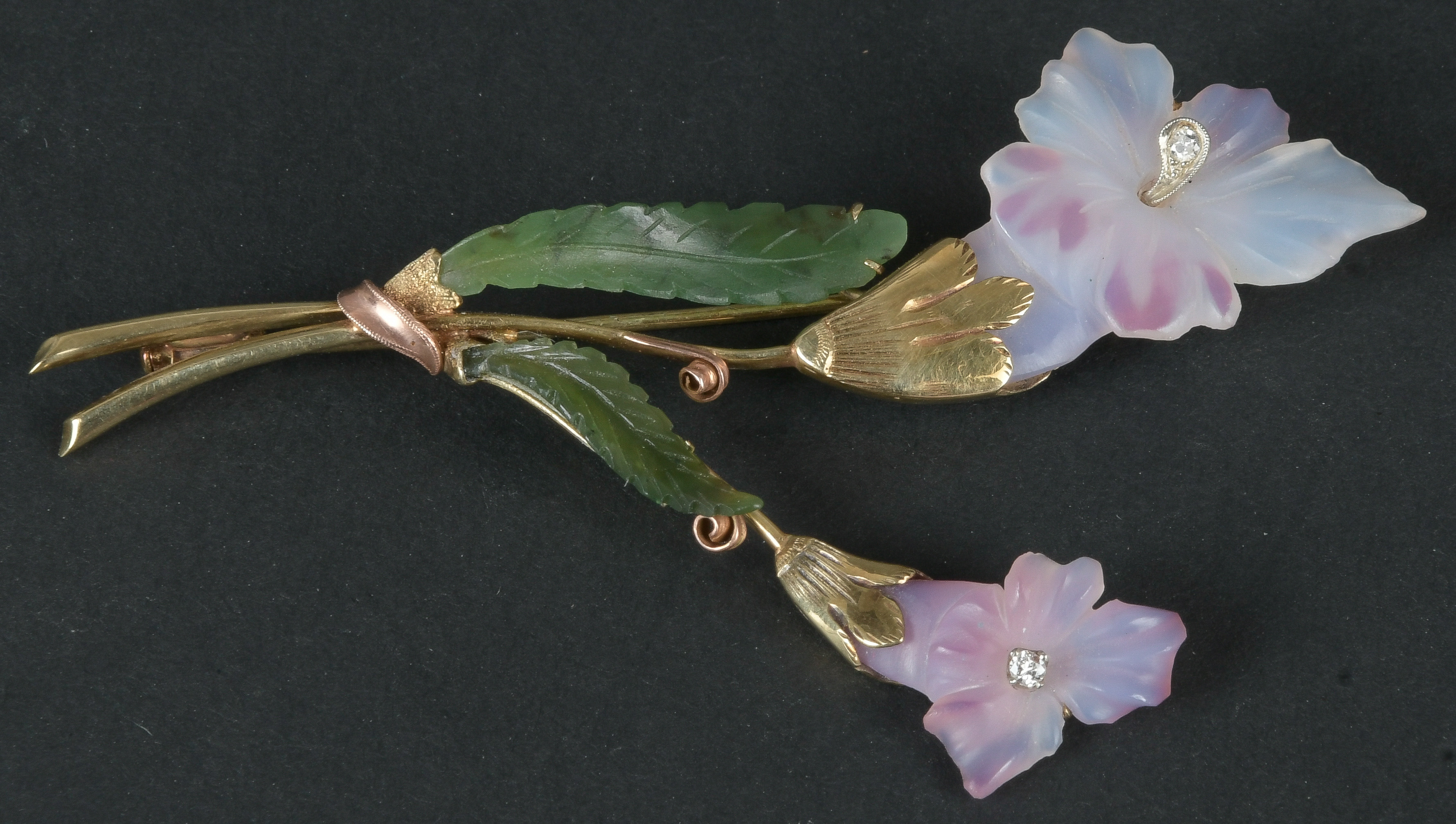 - Katalog-Nr: 2239Brosche. 14 kt Gold, besetzt mit Brillanten, ca. 0,04 ct, und Jade, Gesamtgewicht ca. 11,98 g.o.L.