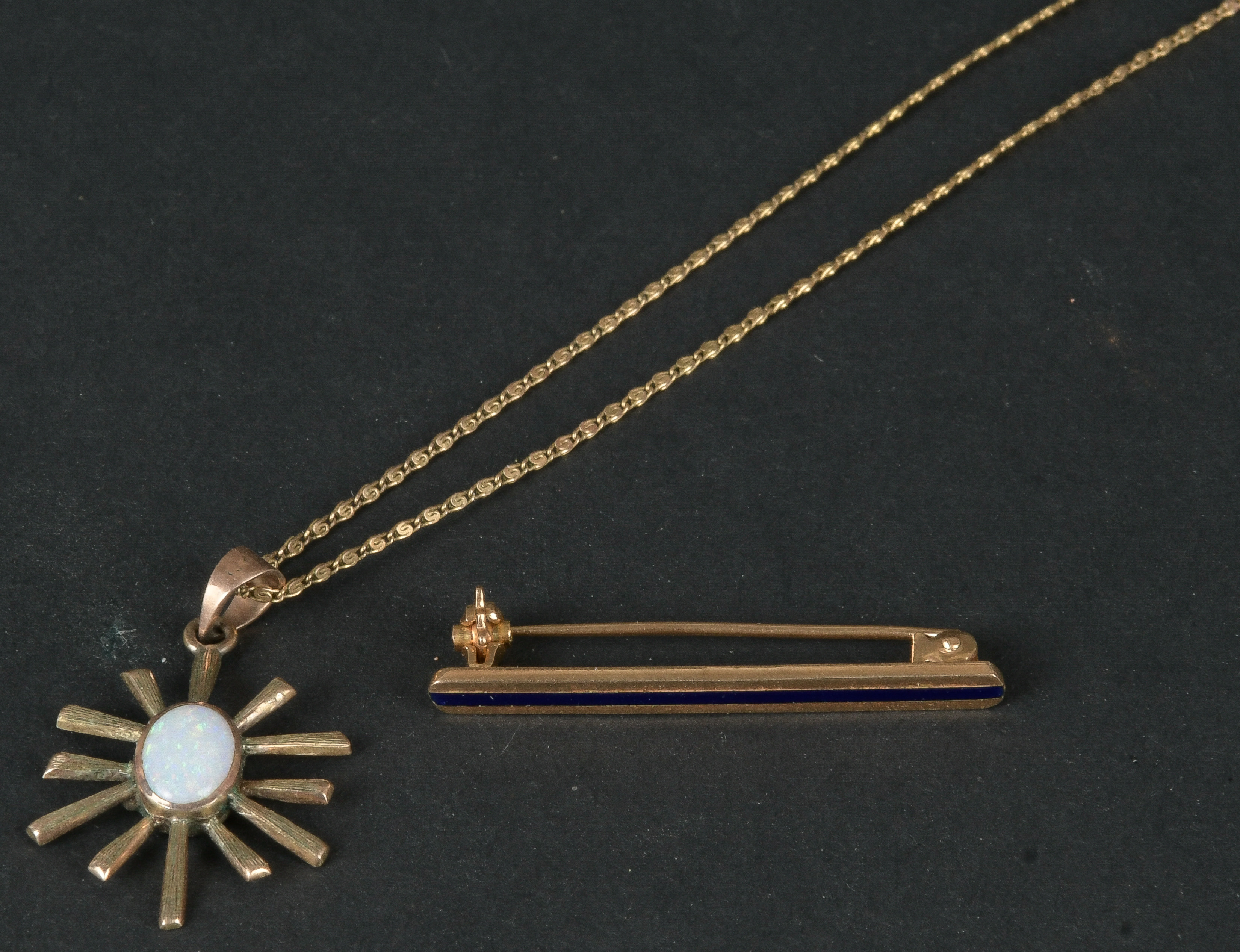 - Katalog-Nr: 2242Halskette mit Anhänger und Stabbrosche. 18 kt Gold, besetzt mit Opal, teilw. emailliert, Gesamtgewicht ca. 5,85 g, L=38 cm.o.L.