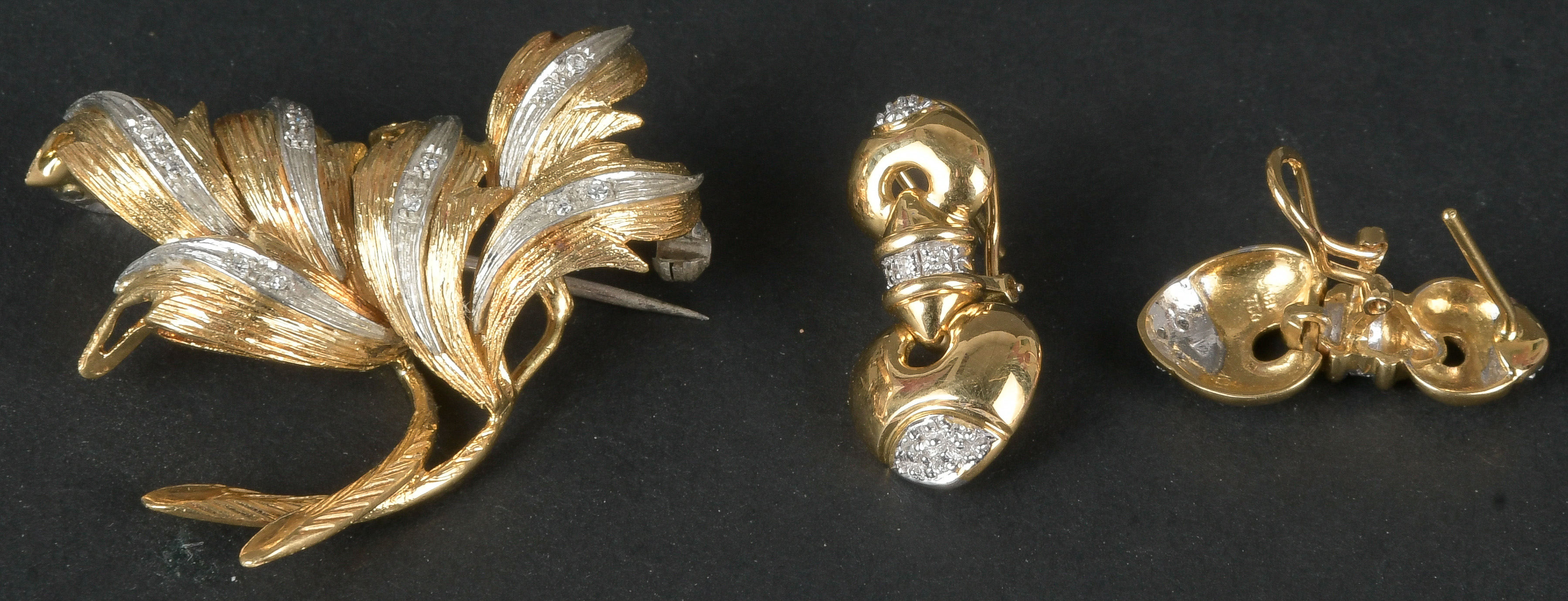 - Katalog-Nr: 2243Brosche und Paar Ohrstecker. 18 kt Gold, besetzt mit Diamanten, ca. 0,25 ct, Gesamtgewicht ca. 18,72 g.o.L.