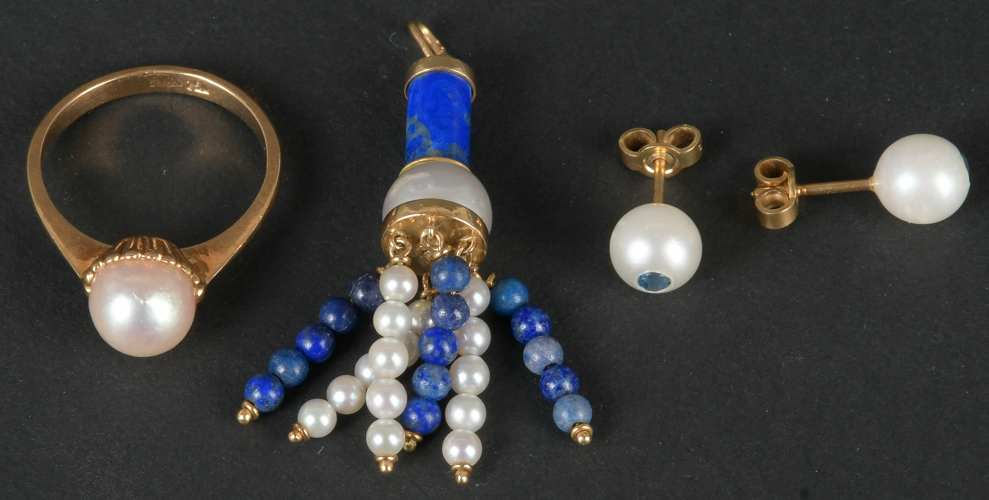 - Katalog-Nr: 2248Anhänger, Paar Ohrstecker und Damenring. 18 kt Gold, besetzt mit Lapislazuli und Perlen, Gesamtgewicht ca. 9,74 g, Ringgröße 56.o.L.