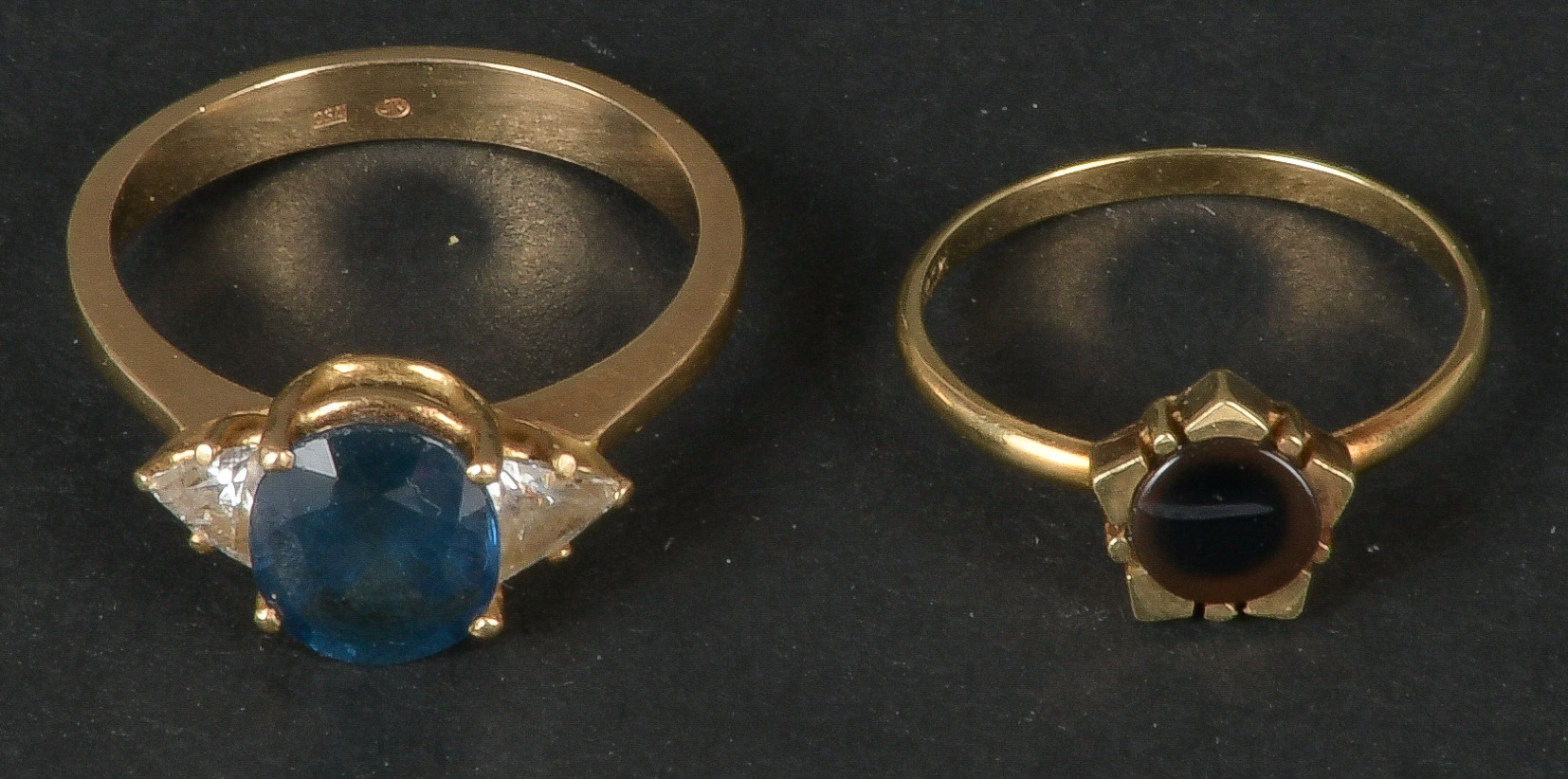 - Katalog-Nr: 2249Zwei Damenringe. 18 kt Gold, u.a. besetzt mit Saphir und Diamanten, ca. 0,20 ct, Gesamtgewicht ca. 4,90 g, Ringgröße 48 / 52.o.L.