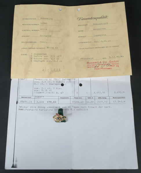 - Katalog-Nr: 2241Damenring. 18 kt Gold, besetzt mit sieben Brillanten, ca. 0,25 ct, sieben Saphiren, vier Smaragden und vier Rubinen, Gesamtgewicht ca. 5,91 g, Ringgröße 64. Zertifikat von Bossert & Co GmbH, Pforzheim 2.12.1990, und Rechnung über DM 3.192,00 liegen vor.o.L.
