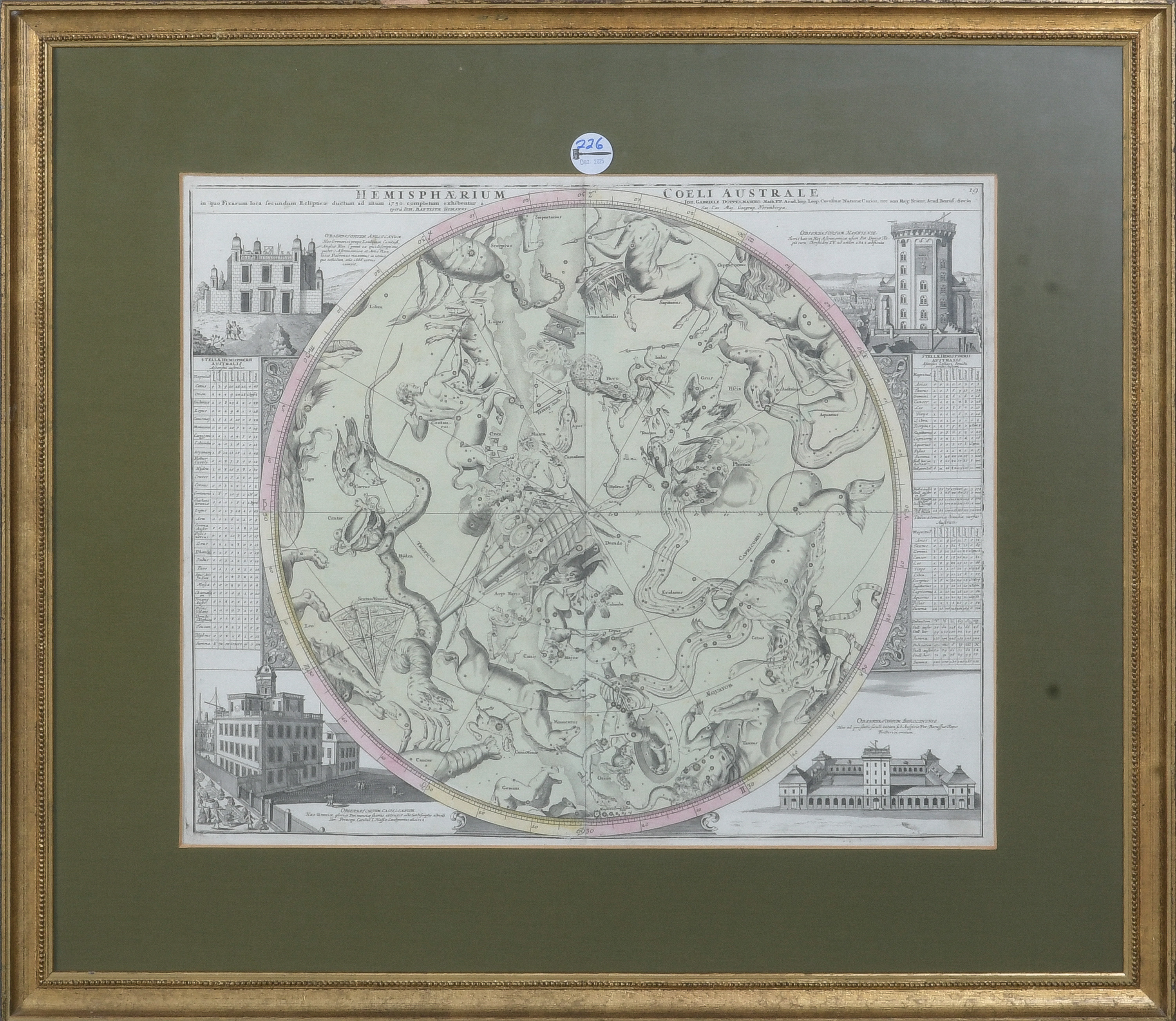 - Katalog-Nr: 226Johann Baptist Homann (1664-1724). Doppelmayrs Himmlischer Atlas. Colorierter Kupferstich, li./o./sign./dat. 1730, mit Passepartout hi./Gl. gerahmt, 49 x 58 cm.o.L.