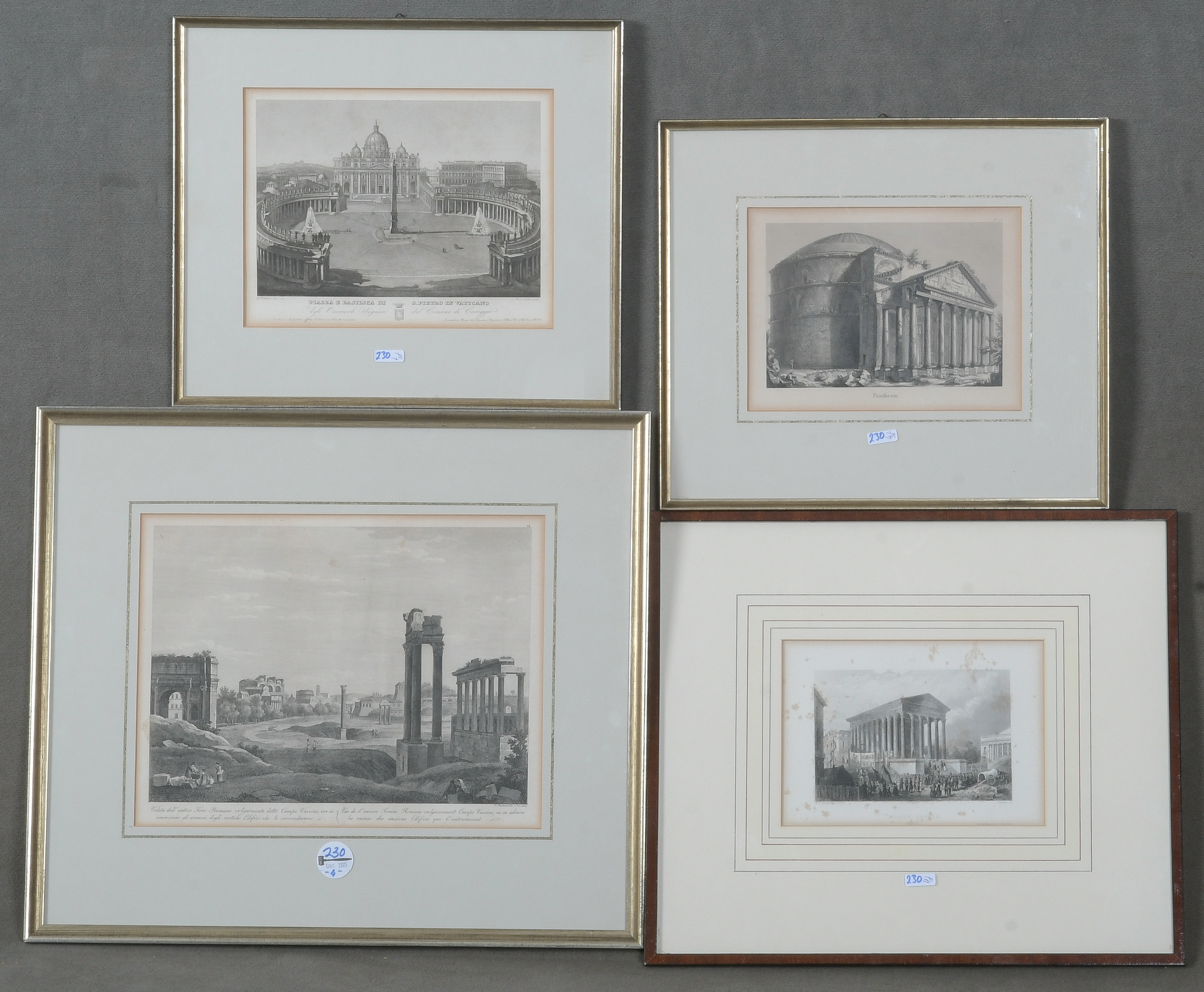 - Katalog-Nr: 230Vier Druckgraphiken: Pietro Parboni (1783-1841), „Foro Romano“, Kupferstich, re./u./sign.; François Alexandre Pernot (1793-1865), „Maison Carrée“, Kupferstich, li./u./sign.; Carl August Peter Menzel (1794-1853), „Pantheon“, Stahlstich; Tommaso Cuccioni (1790-1864), „Piazza e Basilica“, Stahlstich, li./u./sign., je mit Passepartout hi./Gl. gerahmt, 11 x 16,5 bis 23,5 x 32 cm.o.L.