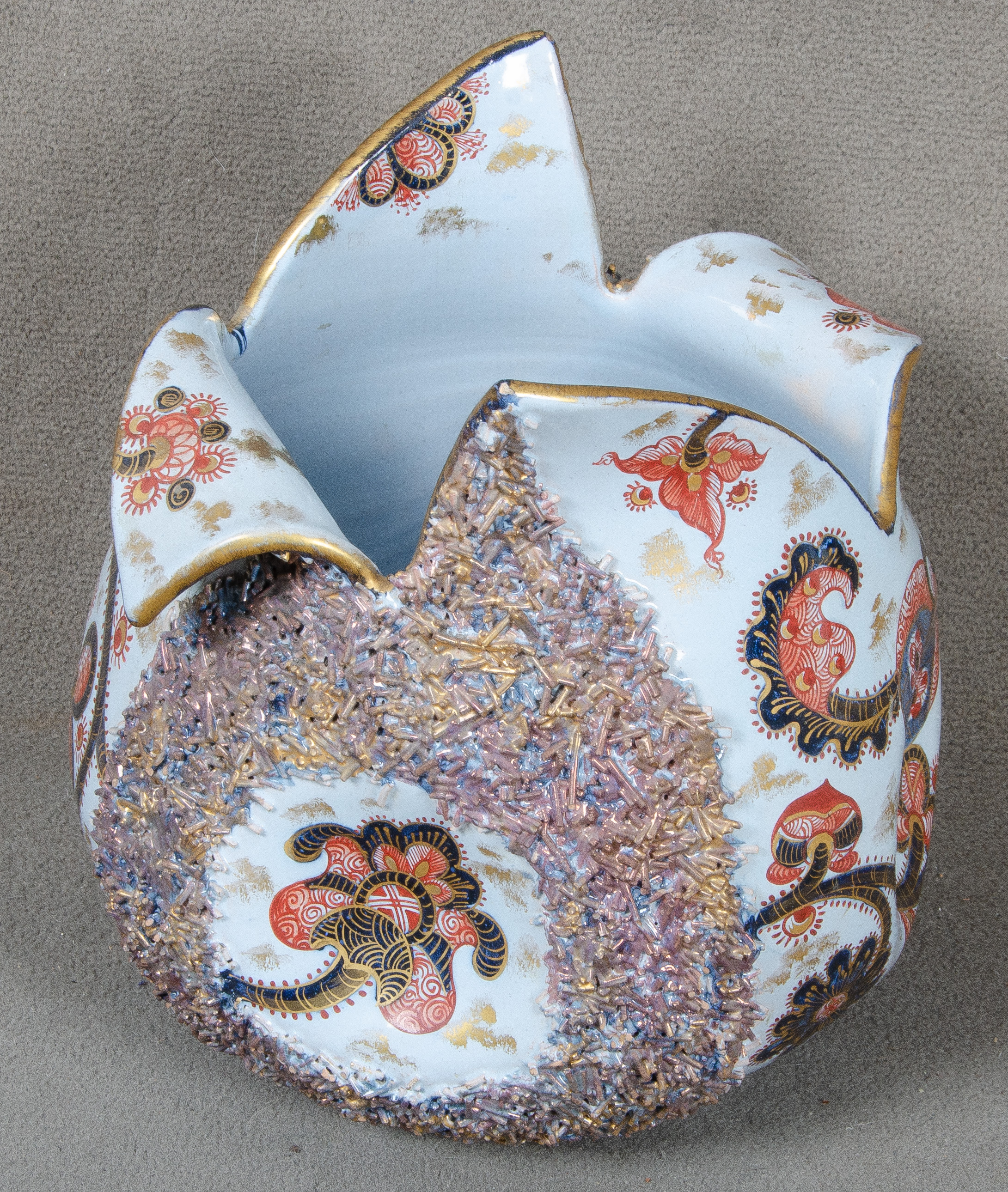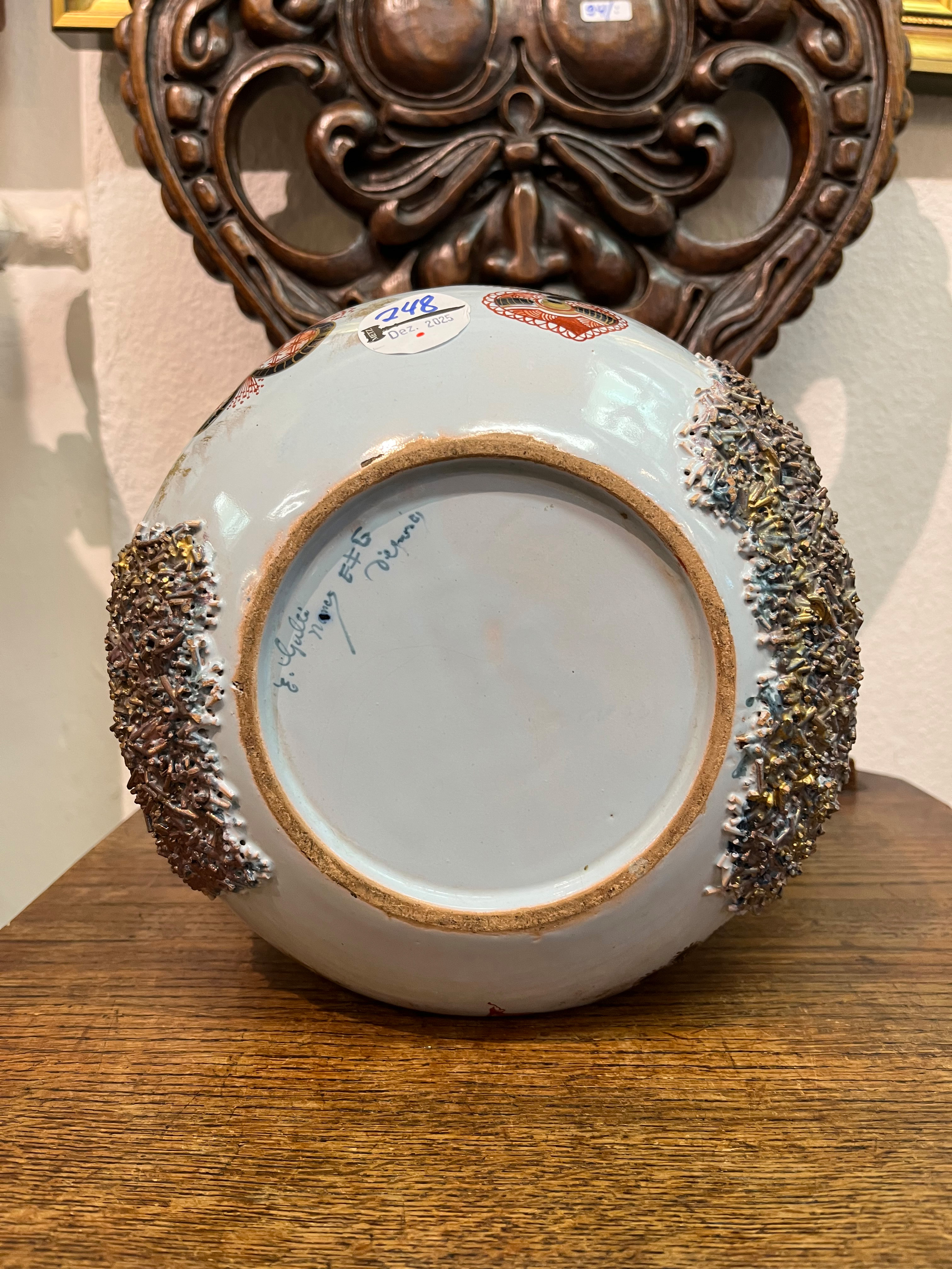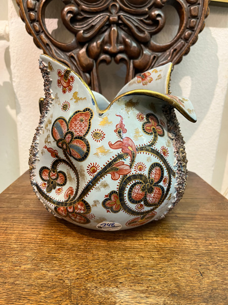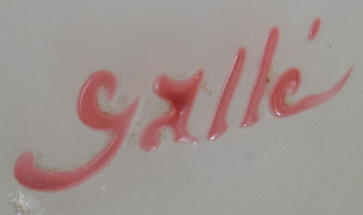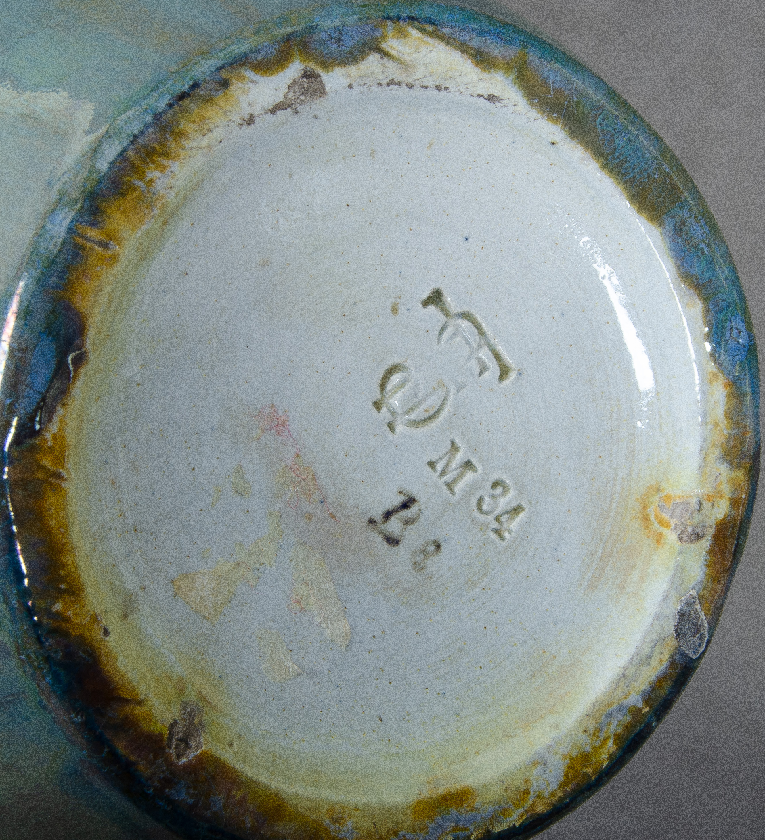 - Katalog-Nr: 248Jugendstil-Vase. Nancy, Émile Gallé um 1900. Keramik, mit aufbossiertem Reisigdekor, gold bemalt, hellblauem Fond und bunt gemaltem Floraldekor; am Boden Schriftzugsmarke, H=22,5 cm. (rest.)o.L.