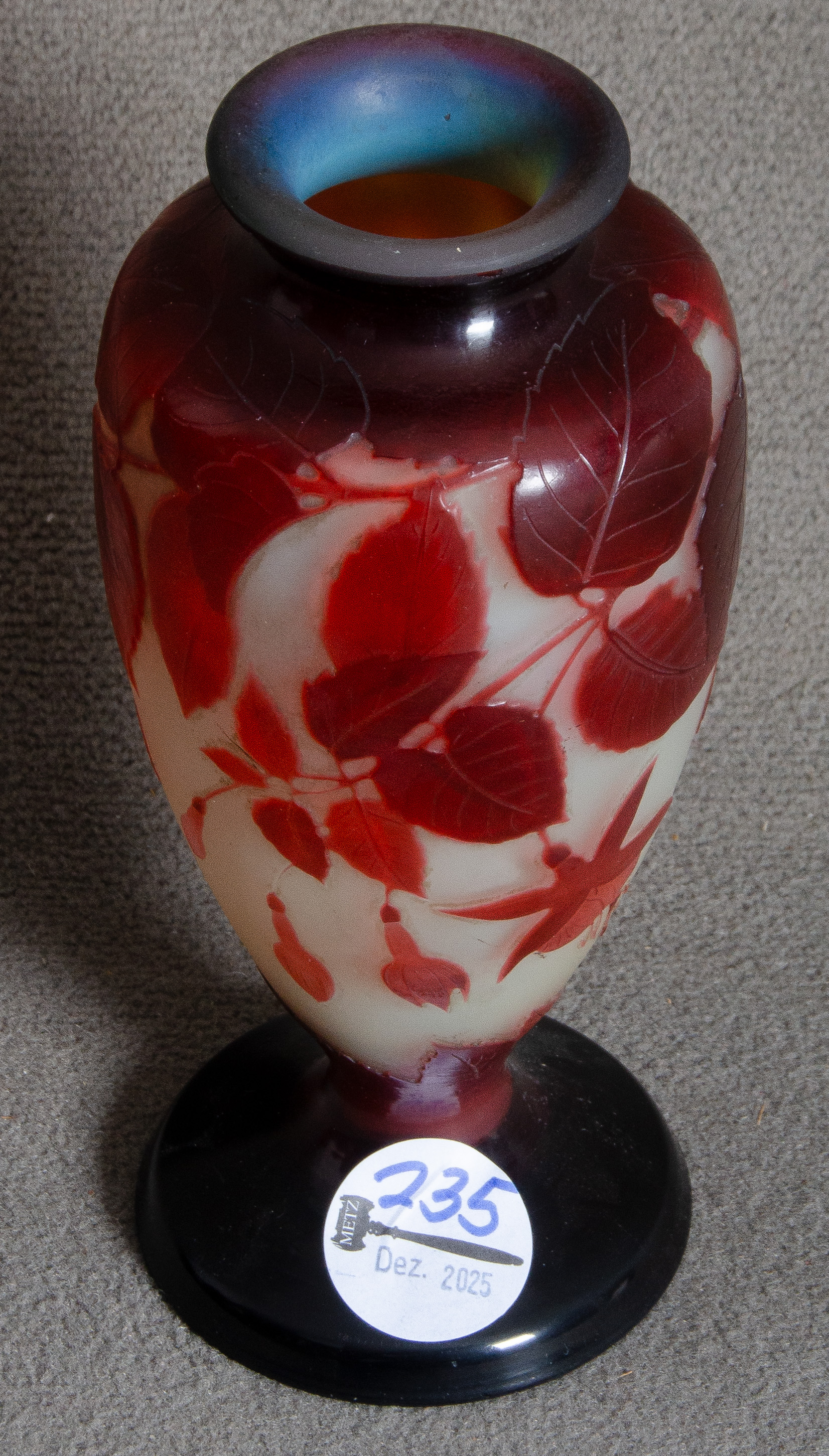 - Katalog-Nr: 235Jugendstil-Vase. Nancy, Émile Gallé um 1900. Farbloses Glas, farbig überfangen, umlaufend floral geschnitten, geätzt und poliert; an der Wandung sign., H=17 cm.o.L.