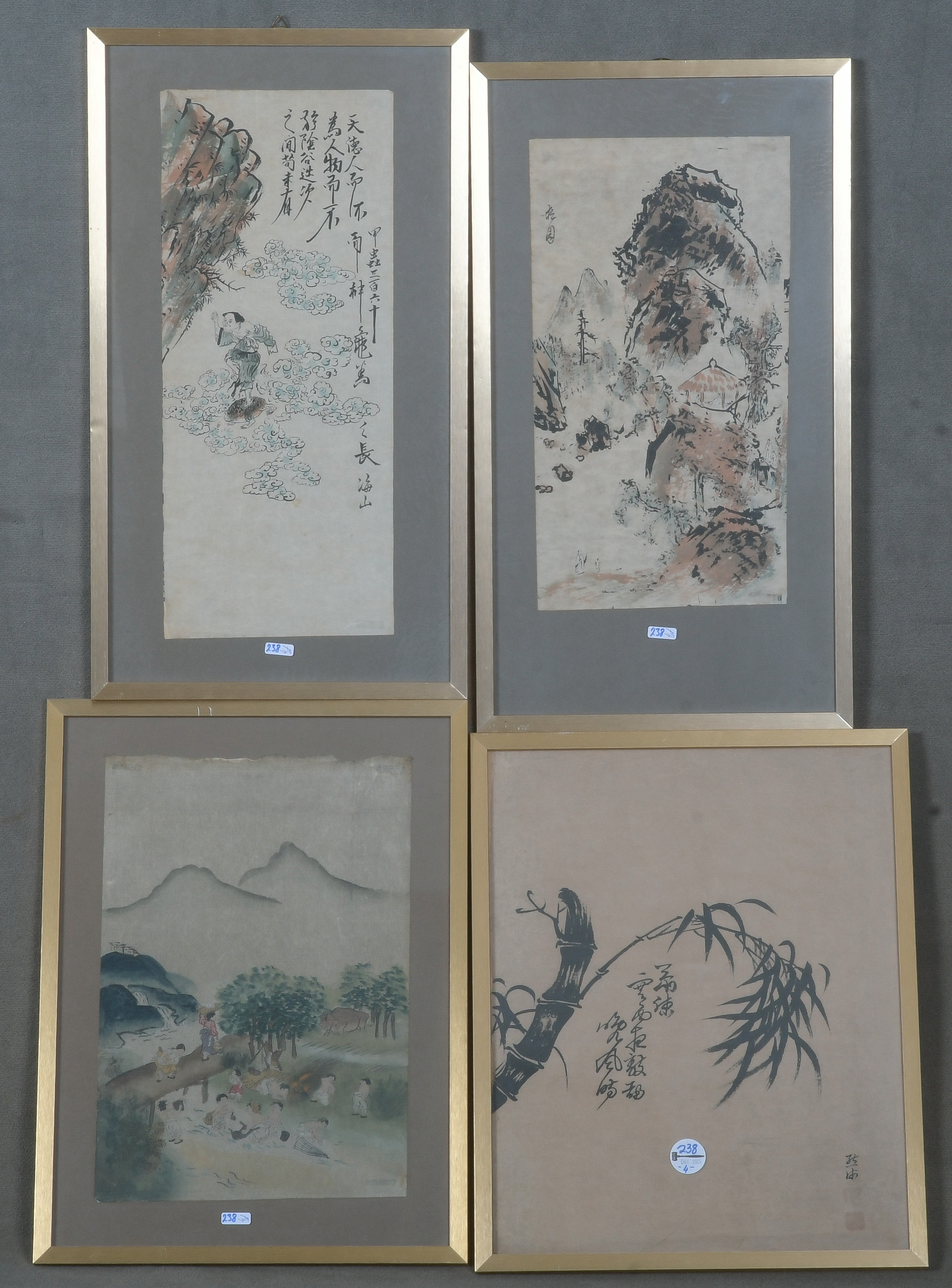 - Katalog-Nr: 238Asiatischer Maler des 20. Jhs. Drei Landschaften, teilw. mit Personenstaffage, und Bambuszweig. Vier Tuschfederzeichnungen, re. bzw. li./o./sign., mit Passepartout hi./Gl. gerahmt, 39 x 27 bis 48,5 x 20,5 cm.o.L.