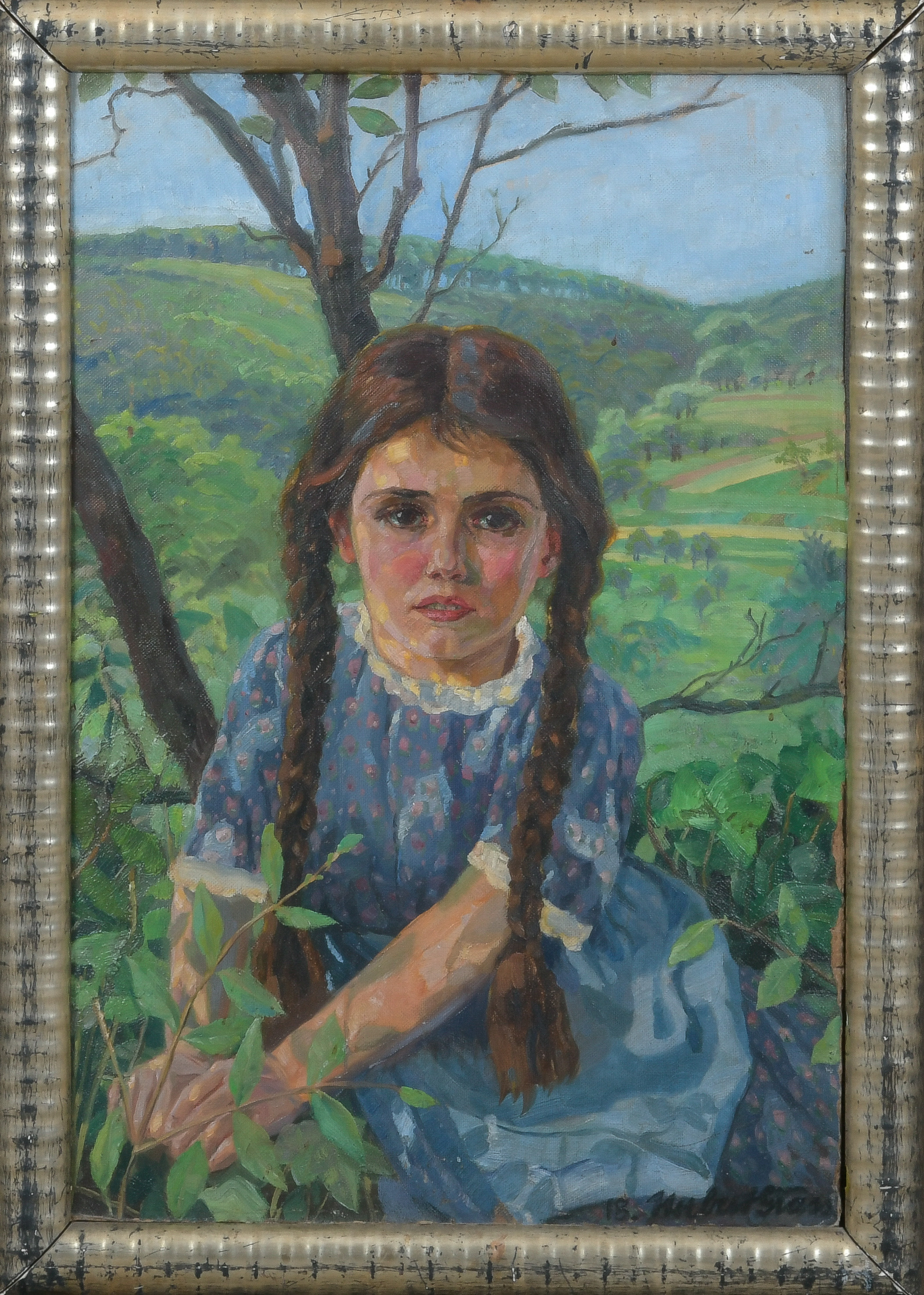 - Katalog-Nr: 241Herbert Grass (1886-1978). Mädchen mit Zöpfen in Landschaft. Öl/Malkarton aufgezogen, re./u./sign., gerahmt, 74 x 49 cm.o.L.