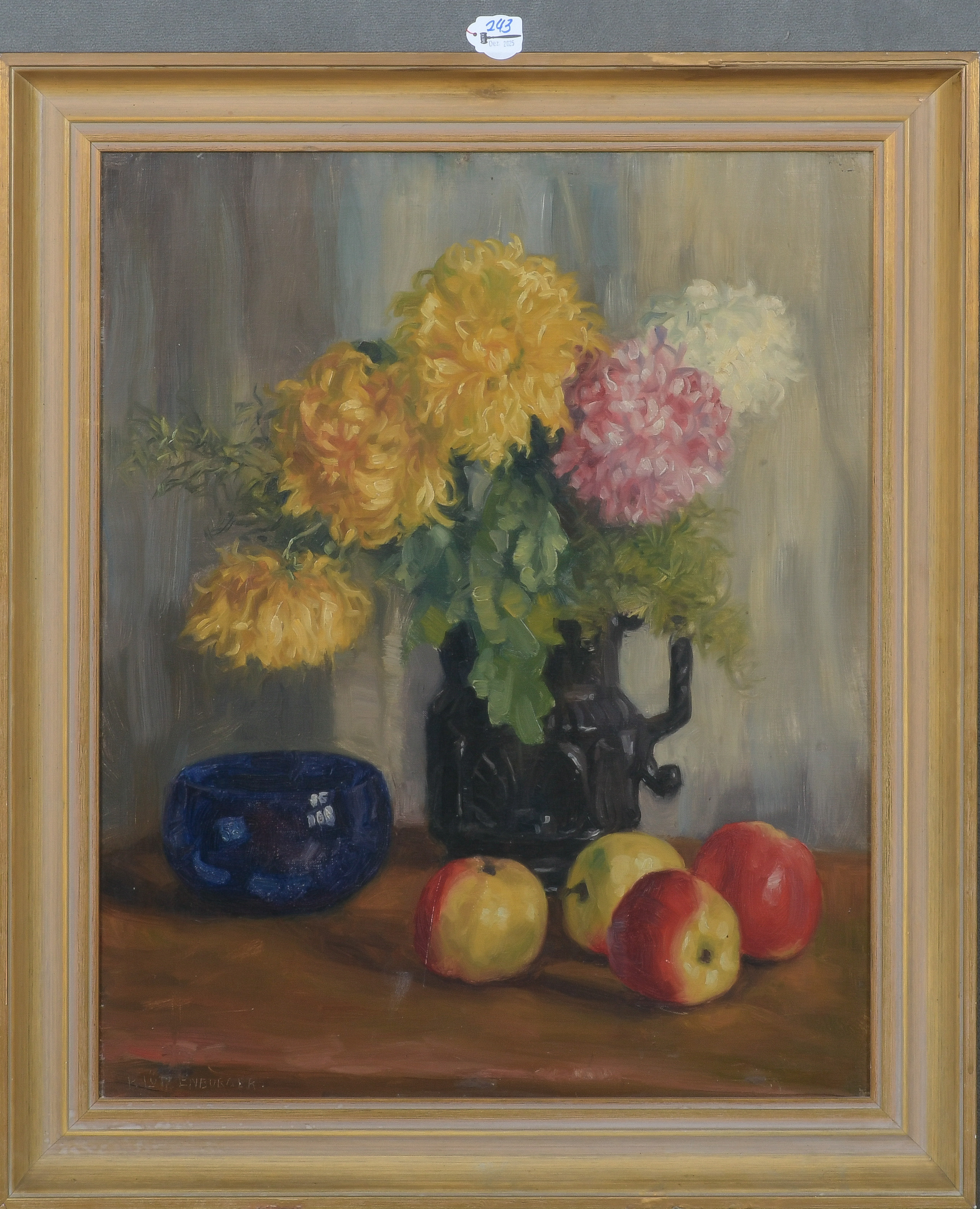 - Katalog-Nr: 228F.H. Edward (Maler des 20. Jhs.). Weg mit Bäumen. Öl/Lw., re./u./sign., gerahmt (27 x 22 cm); dazu Maler des 19. Jhs. Obststillleben. Öl/Lw., gerahmt, 22,5 x 32,5 cm.o.L.