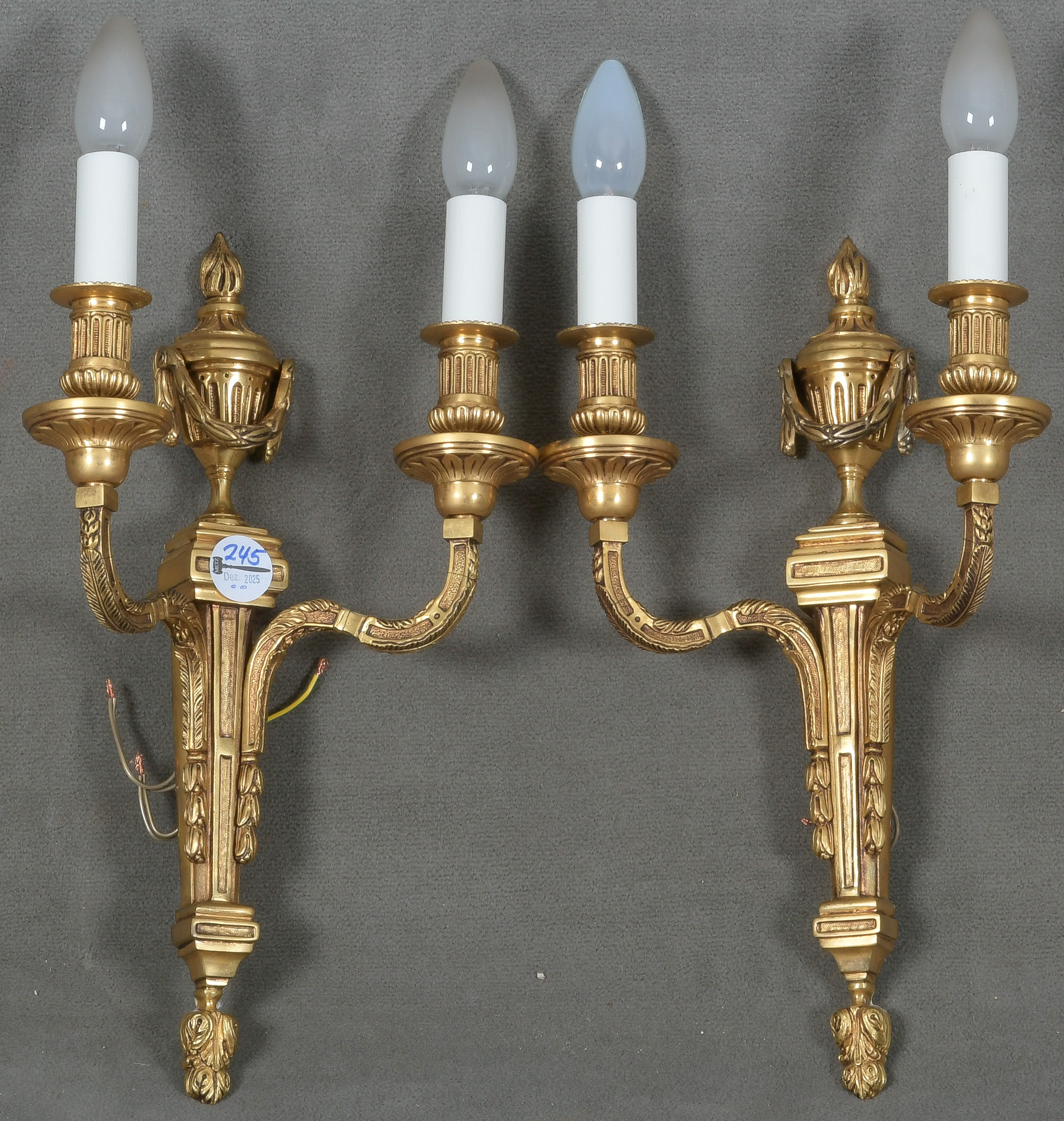 - Katalog-Nr: 245Paar Wandappliken im Louis XVI-Stil. Frankreich 20. Jh. Bronze, vergoldet, mit Blättern, hängenden Tüchern, Kanneluren, Knospen und Vasen, H=40,5 cm, B=24,5 cm, T=12,5 cm. (Funktion ungeprüft)o.L.