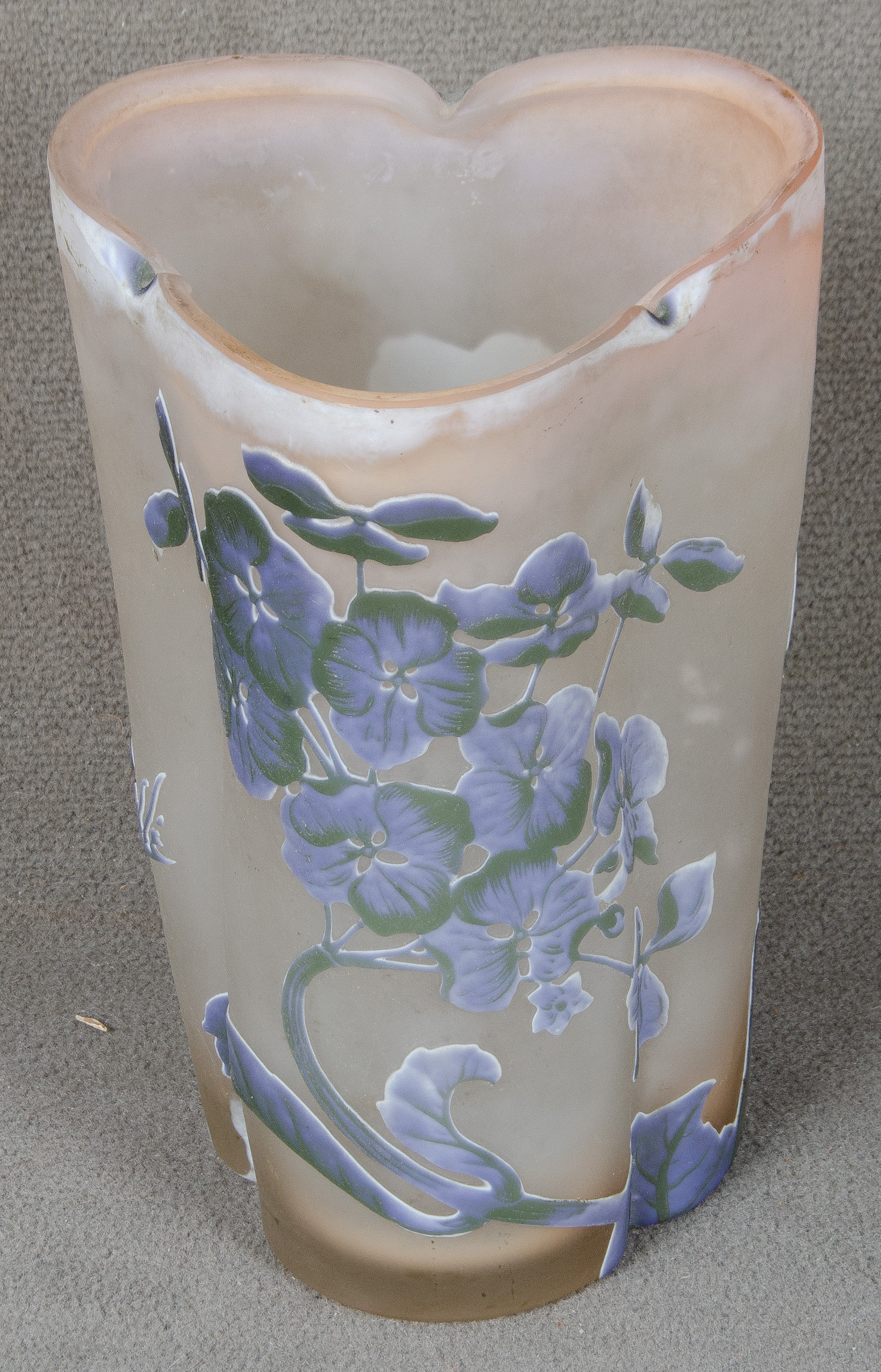 - Katalog-Nr: 249Jugendstil-Vase. Nancy, Émile Gallé um 1900. Farbloses Glas, farbig überfangen, umlaufend floral geschnitten; an der Wandung sign., H=21,5 cm.o.L.