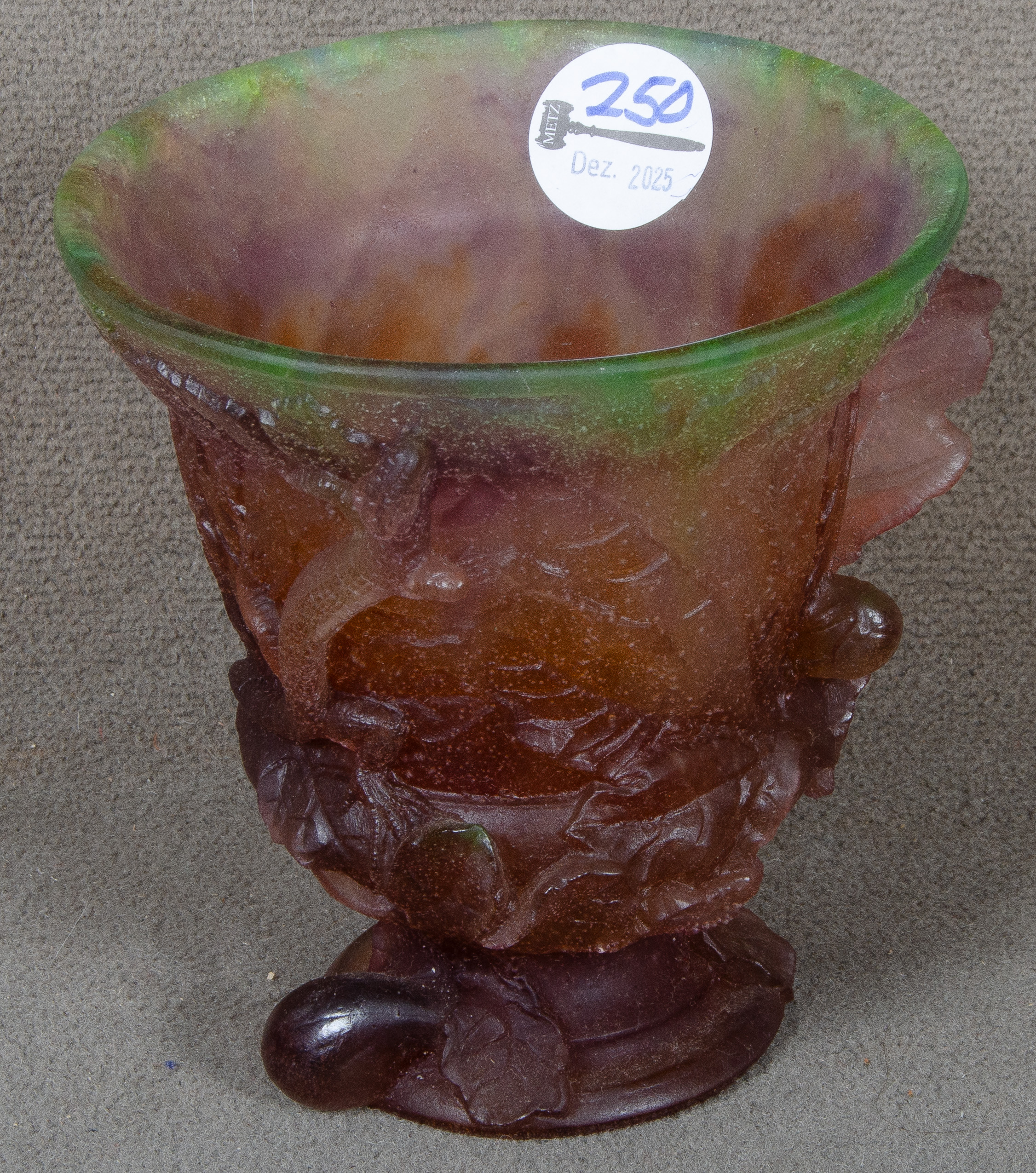 - Katalog-Nr: 250Vase. Nancy, Daum Frères 20./21. Jh. Dickwandiges Glas, mit erhabenen Echsen und Blattdekor; am Boden sign., H=15 cm.o.L.
