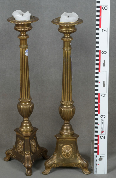 - Katalog-Nr: 244Paar Altarleuchter. Deutsch 20. Jh. Messing, mit Maskaronen und Kanneluren; dreipassiger Fuß, sich nach oben verjüngender Schaft, überstehende Tülle, H=je 73,5 cm.o.L.