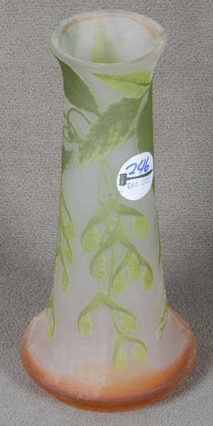 - Katalog-Nr: 246Jugendstil-Vase. Nancy, Émile Gallé um 1900. Farbloses Glas, farbig überfangen, umlaufend floral geschnitten und geätzt; an der Wandung sign., H=25 cm.o.L.