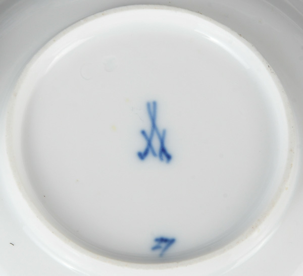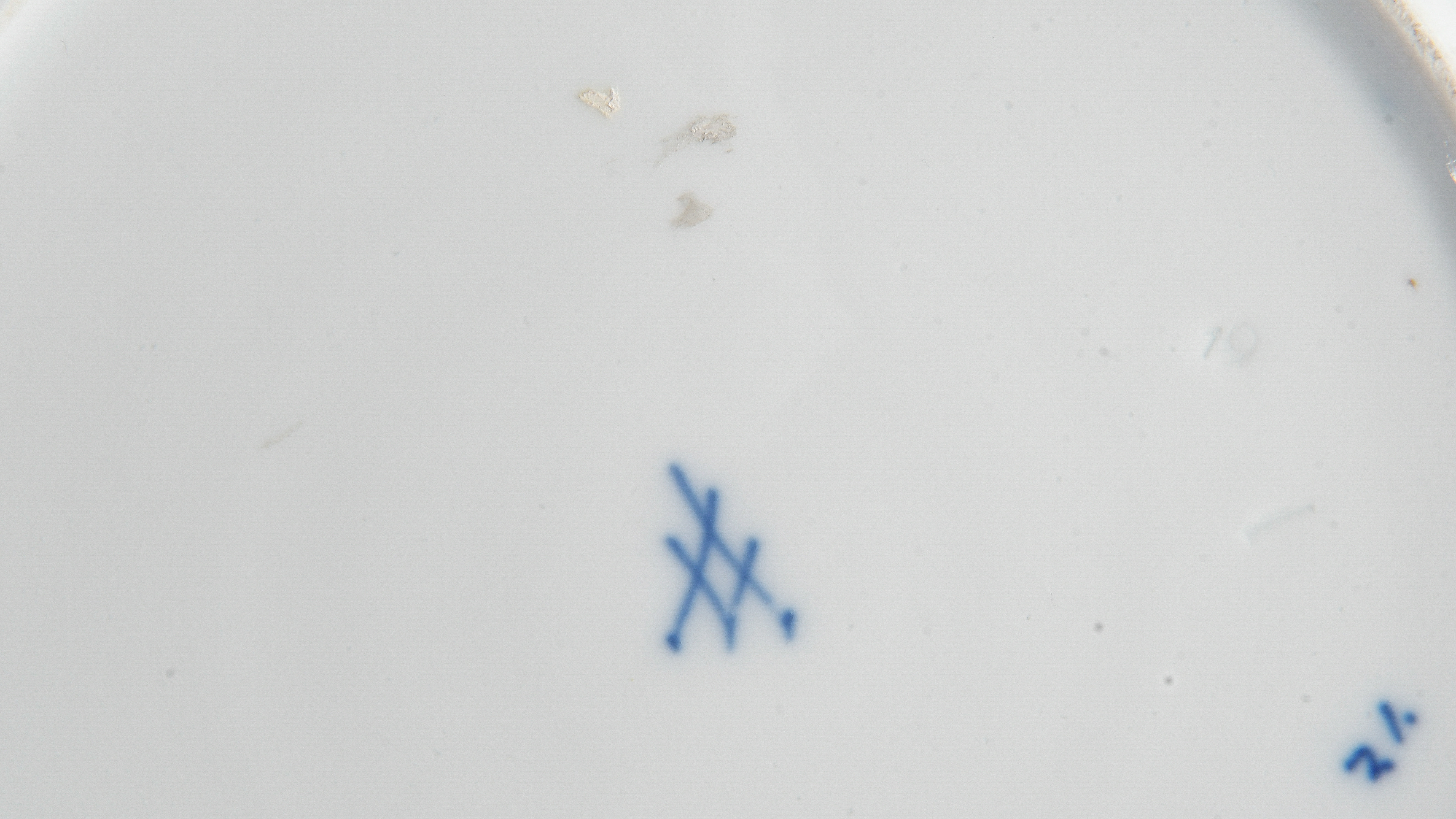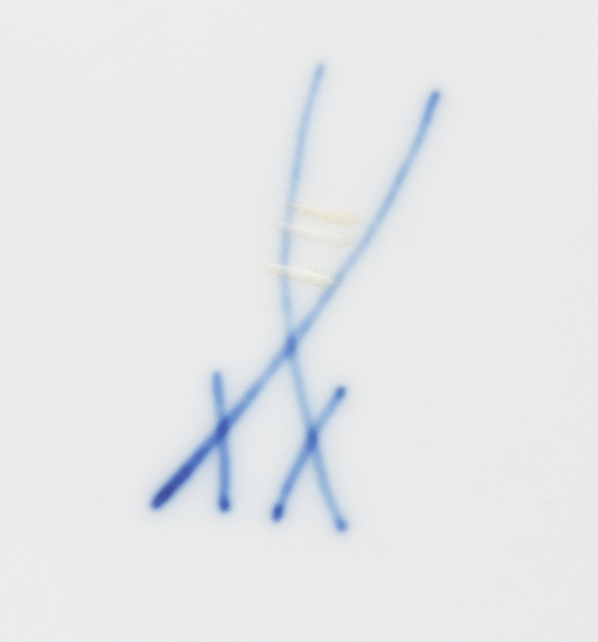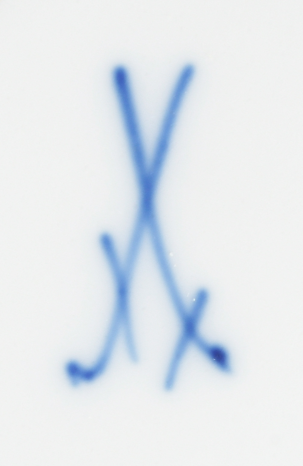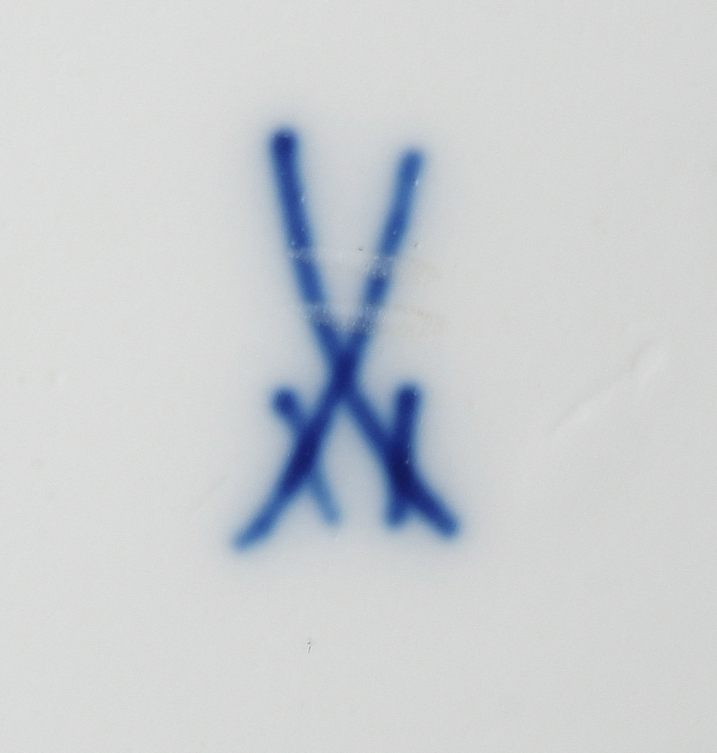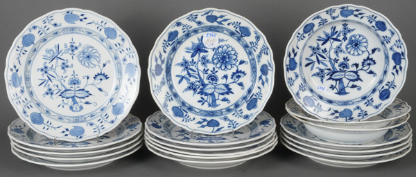 - Katalog-Nr: 234518 Teller „Zwiebelmuster“. Meissen 18. bis 20. Jh. Porzellan, unterglasurblau bemalt; am Boden unterglasurblaue Schwertermarke, teilw. mit einem bis drei Schleifstrichen. Bestehend aus: 15 Speiseteller (D=je 25,5 cm) und drei Suppenteller (D=je 24 cm).o.L.