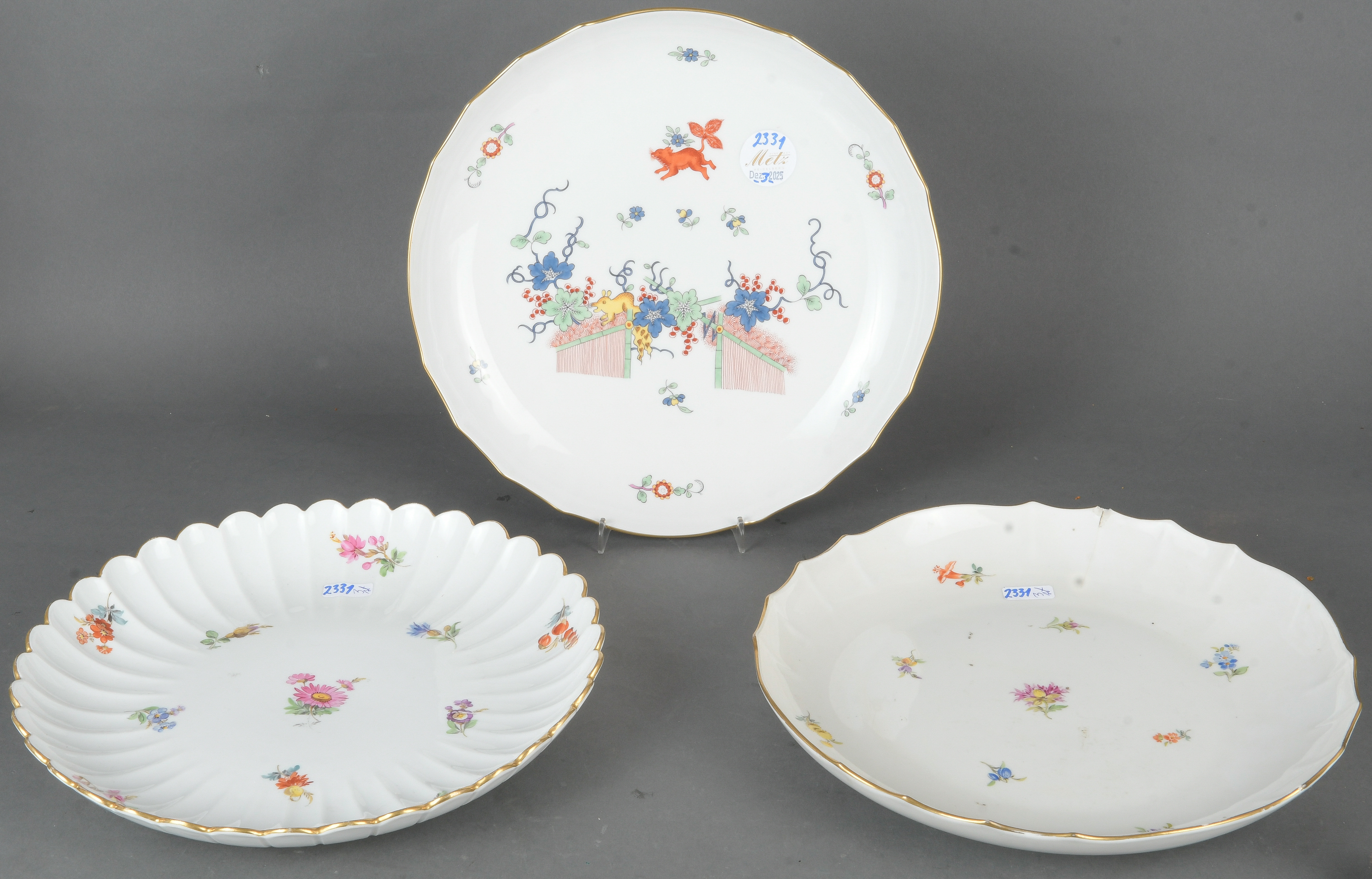 - Katalog-Nr: 2331Drei Schalen „Fliegende Eichhörnchen“. Meissen 20. Jh. Porzellan, bunt bemalt; am Boden unterglasurblaue Schwertermarke, D=27 / 27,5 cm. (eine besch.)o.L.