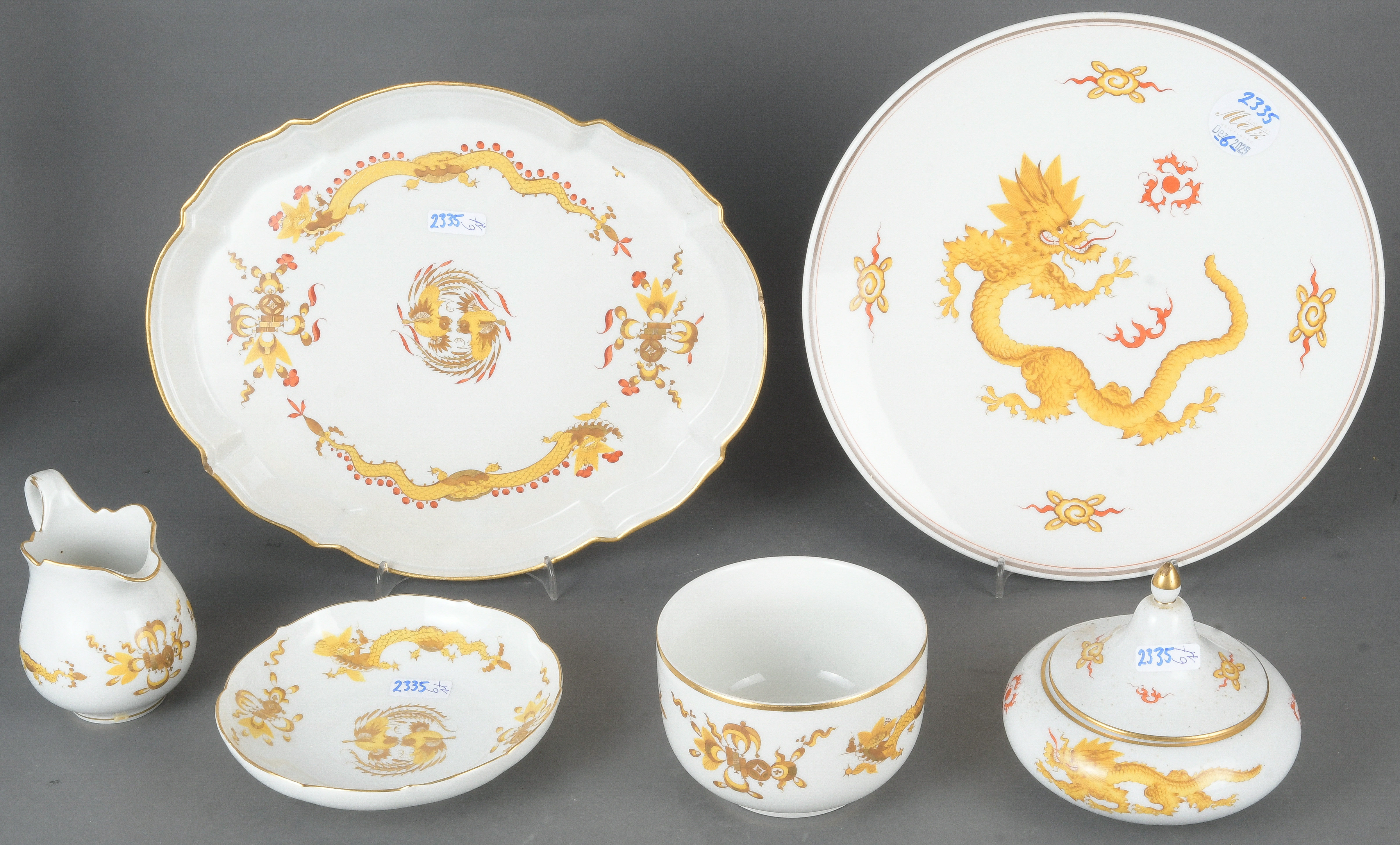 - Katalog-Nr: 2335Sechs unterschiedliche Formteile „Gelber Drache“. Meissen 19./20. Jh. Porzellan, bemalt bemalt; am Boden unterglasurblaue Schwertermarke, teilw. mit einem bis vier Schleifstrichen. Bestehend aus: Ein Milchgießer (H=9,5 cm), eine Deckeldose (H=10 cm), ein Teller (D=25 cm), eine ovale Schale (H=2 cm, B=27 cmk T=22 cm), zwei runde Schalen (D=10,5 / 14 cm). (eine besch.)o.L.