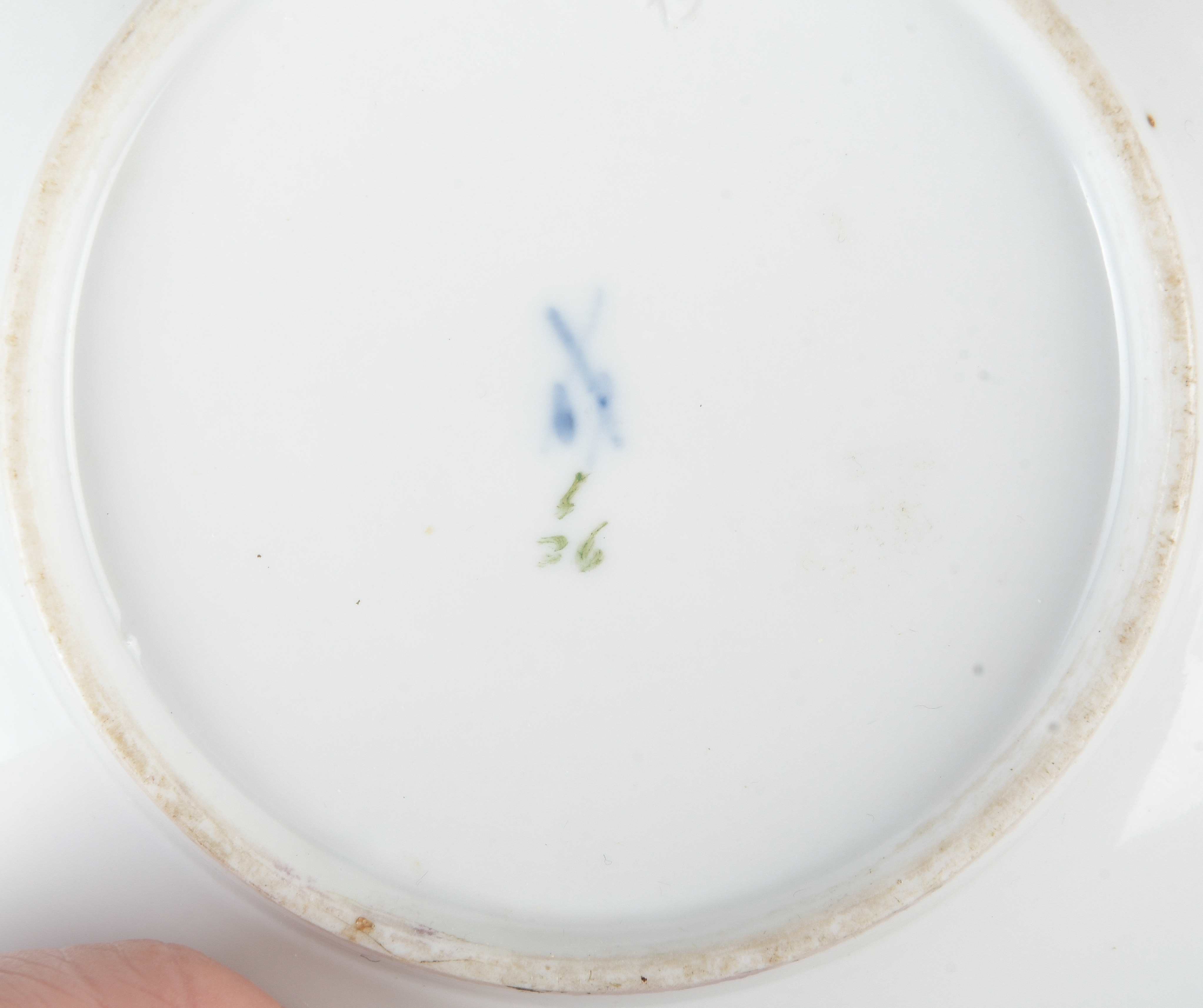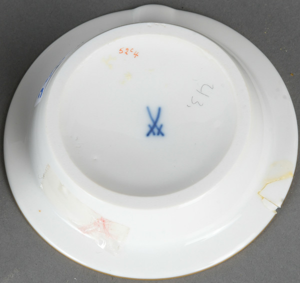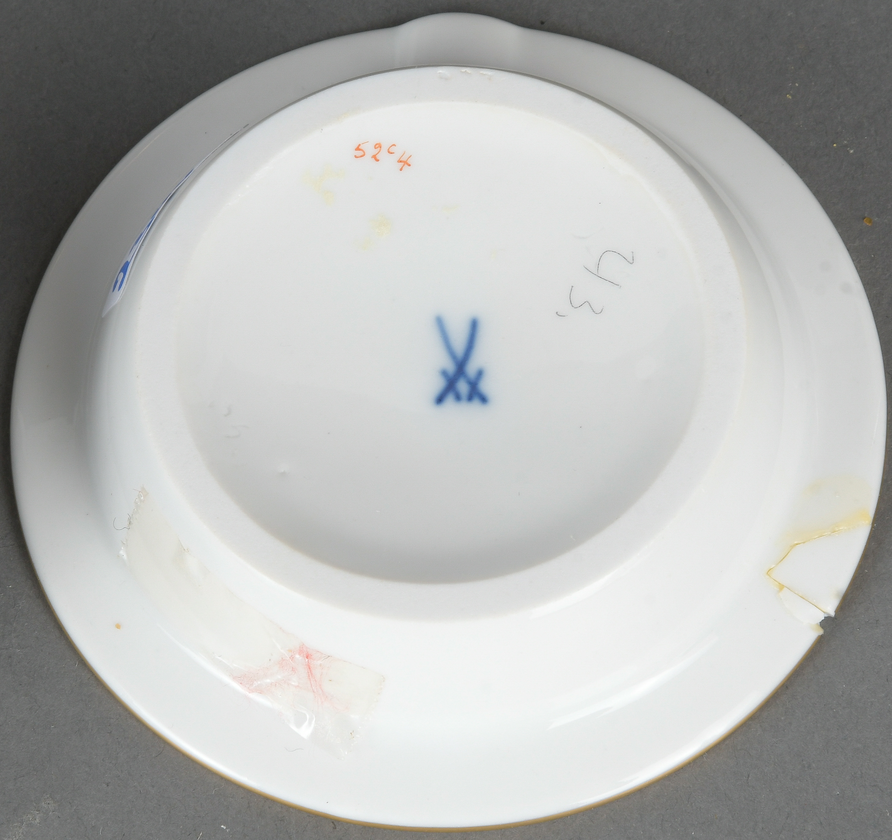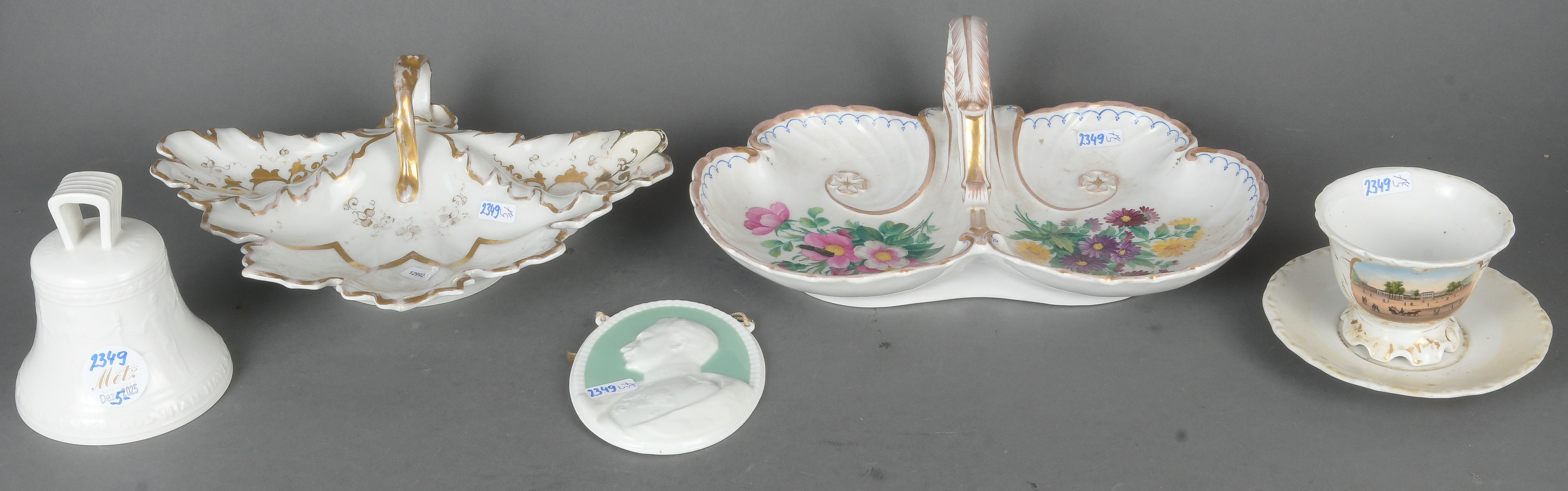 - Katalog-Nr: 2344Sechstlgs. Konvolut unterschiedlicher Formteile. Meissen 19./20. Jh. Porzellan, bunt bemalt und gold gehöht; verso unterglasurblaue Schwertermarke. Bestehend aus: Eine Prunkhenkelschale (H=8,5 cm, B=32,5 cm, T=19 cm), eine Deckeltasse, eine Prunktasse mit Unterschale, ein Kerzenleuchter (H=10 cm), eine Schale (D=22,5 cm) und eine Bisquitporzellan-Medaille (D=5 cm). (ein Teil rest.)o.L.