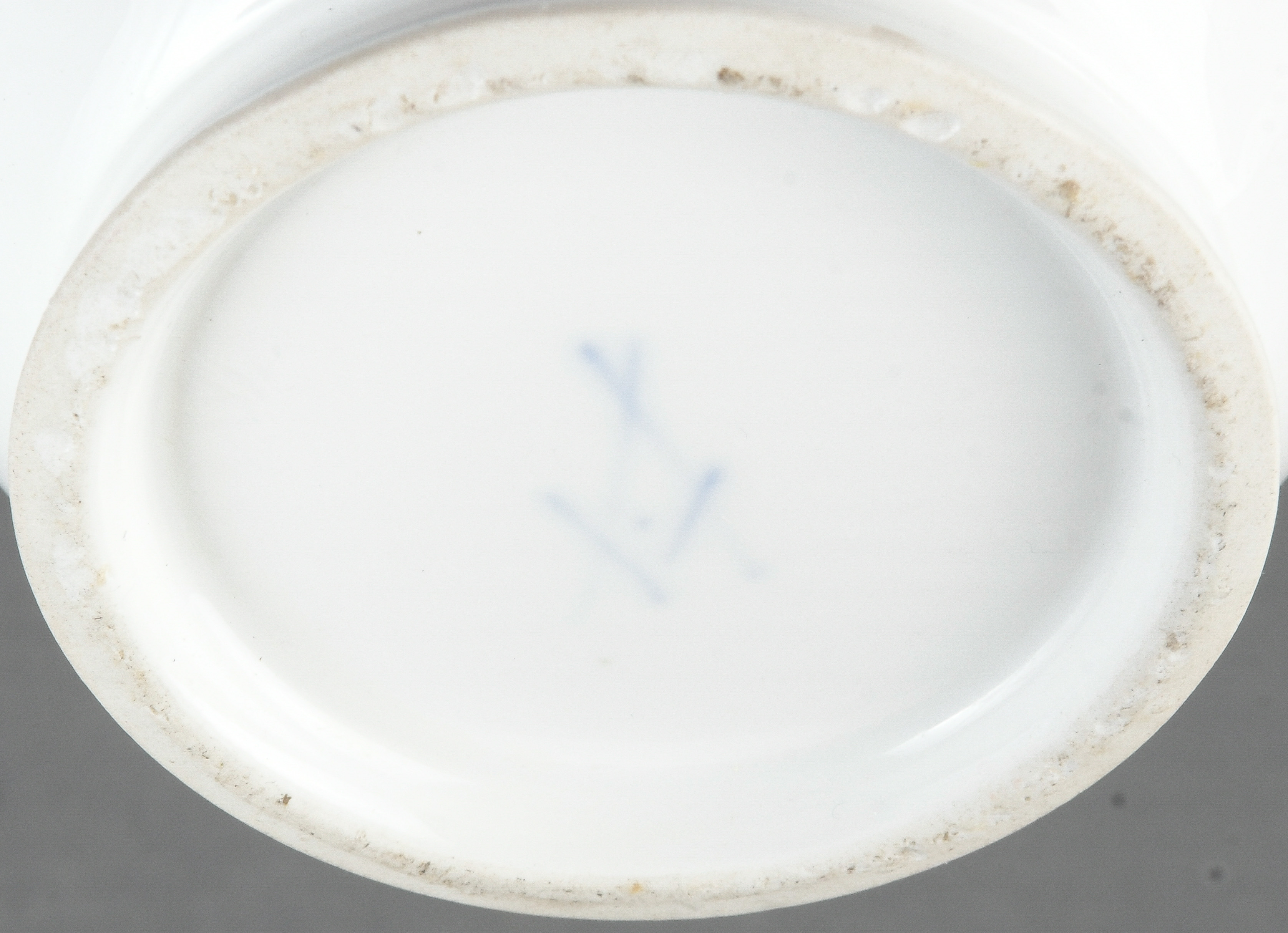 - Katalog-Nr: 2349Fünf unterschiedliche Formteile, u.a. Berlin 19./20. Jh. Porzellan, weiß glasiert, teilw. gold gehöht; meist am Boden unterglasurblaue Szeptermarke, teilw. mit EK. Bestehend aus: Zwei Anbietschalen, eine Glocke, eine Plakette und eine Tasse mit Unterschale, H=9 bis 12 cm.o.L.