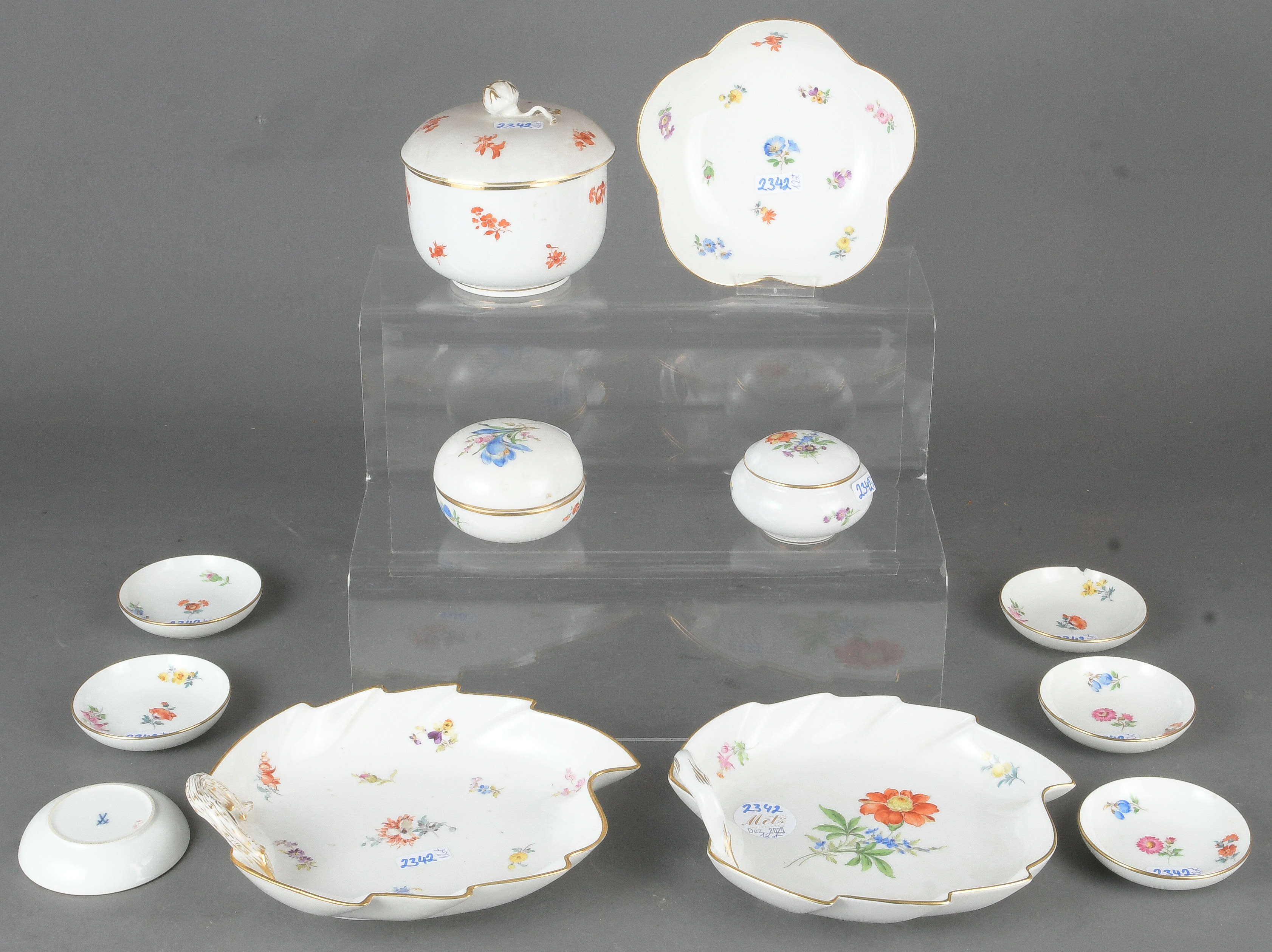 - Katalog-Nr: 2342Zwölftlgs. Konvolut. Meissen 20. Jh. Porzellan, bunt bemalt mit Floraldekor, Goldränder; verso unterglasurblaue Schwertermarke, teilw. mit einem Schleifstrich. Bestehend aus: Zwei Blattschalen (H=3,5 cm, B=21 cm, T=17,5 cm), eine Zuckerdose (H=10,5 cm), eine Schale (H=4 cm, B=14,5 cm, T=14 cm), sechs Schälchen (D=8 cm) und zwei Deckeldosen (H=4,5 cm, D=7,5 cm / H=5 cm, D=8 cm)o.L.