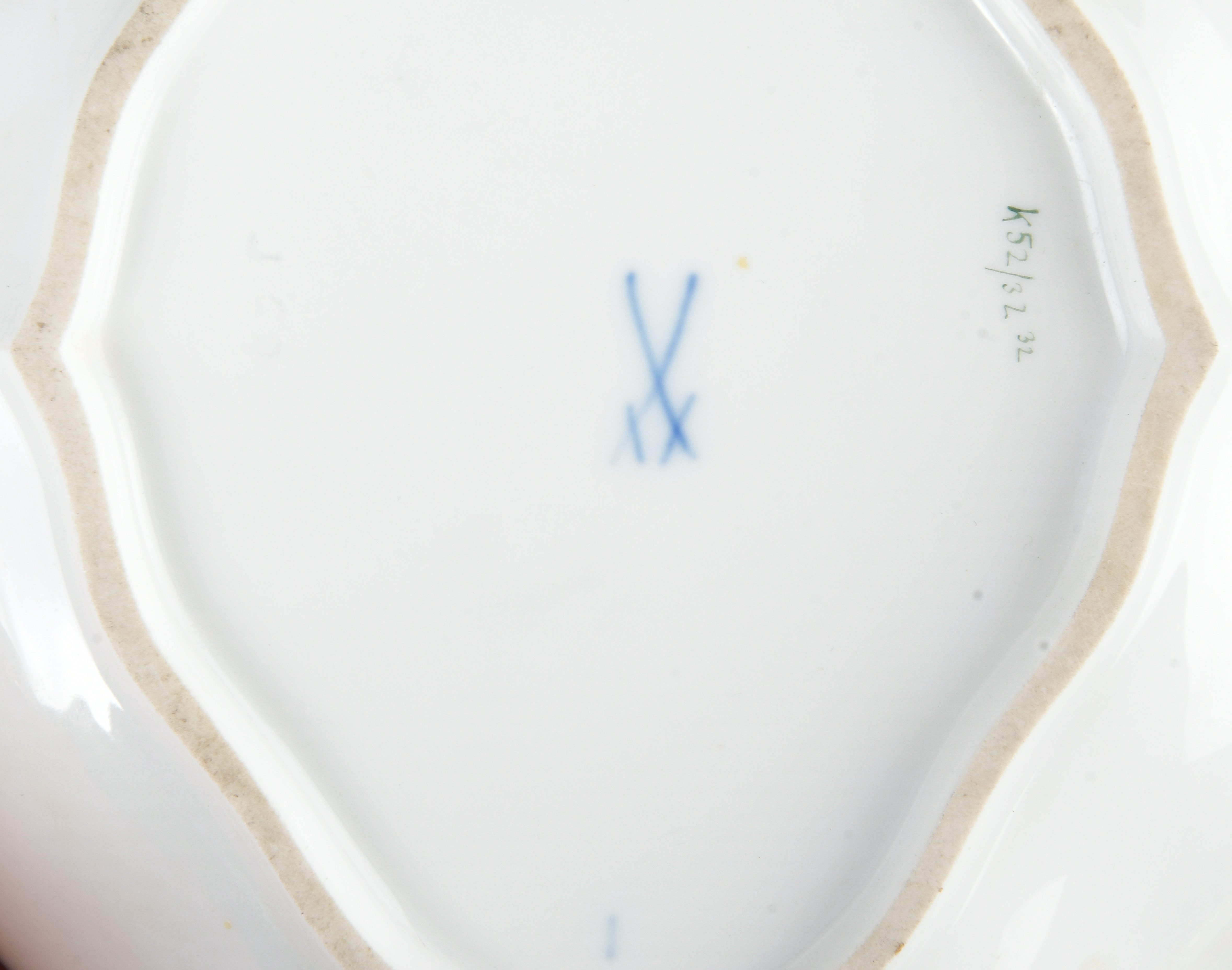 - Katalog-Nr: 2334Sechstlgs. Konvolut. Meissen 20. Jh. Porzellan, bunt bemalt; am Boden unterglasurblaue Schwertermarke. Bestehend aus: Fünf Speiseteller (D=je 23,5 cm) une eine Blattschale (H=5,5 cm, B=23 cm, T=18 cm).o.L.