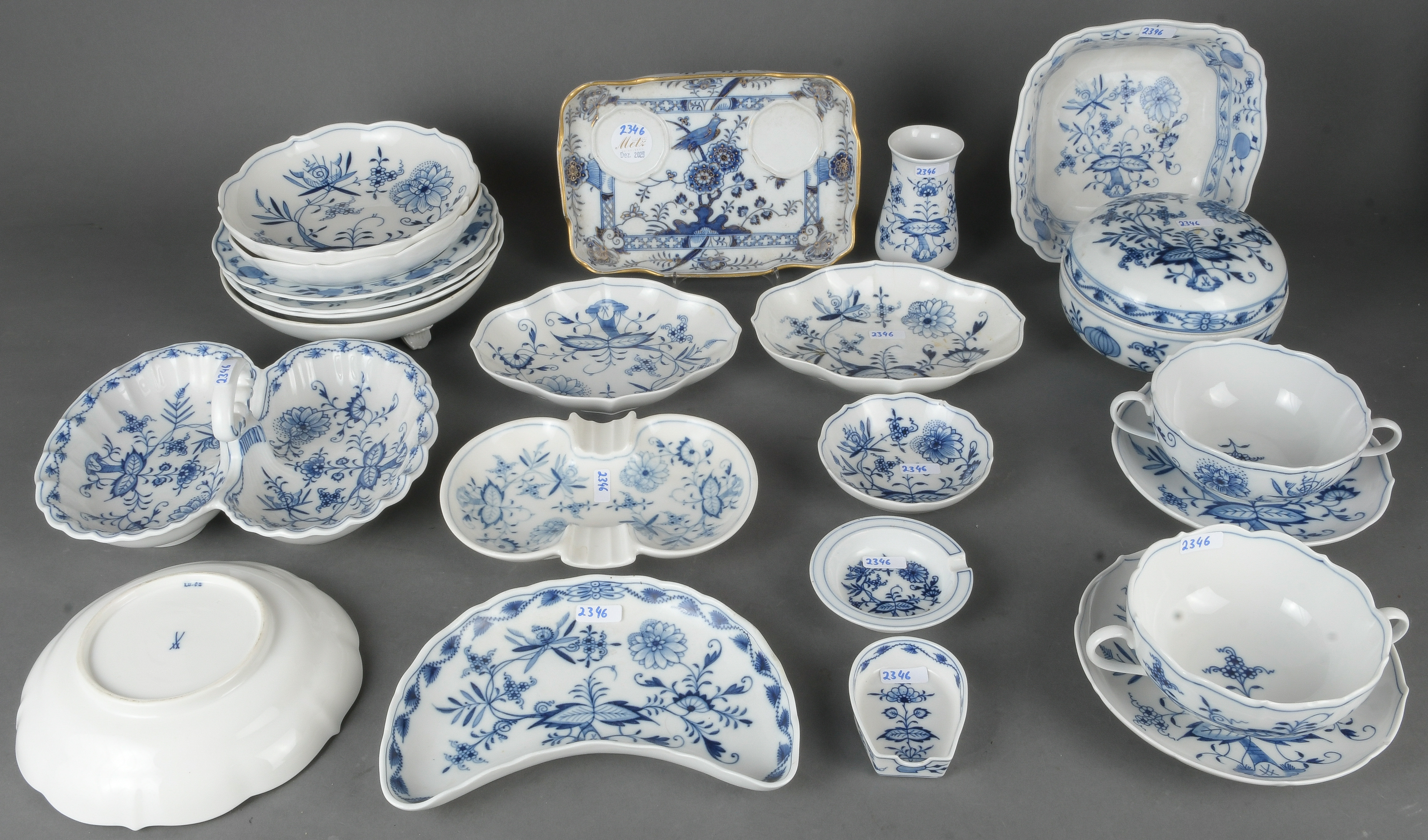 - Katalog-Nr: 234618 unterschiedliche Formteile „Zwiebelmuster“. Meissen 19./20. Jh. Porzellan, unterglasurblau bemalt, teilw. mit Goldrand; am Boden unterglasurblaue Schwertermarke, teilw. mit einem bis vier Schleifstrichen. Bestehend aus: Zwei Suppentassen mit Unterschalen, eine Doppelhenkelschale (H=9 cm, B=19,5 cm, T=24 cm), eine quadratische Schale (H=6 cm, B=19 cm), eine Vase (H=10,5 cm, D=9,5 cm), drei Aschenbecher (B=8 bis 19 cm), eine kleine Schale (D=11 cm), drei Schalen (D=17,5 cm), eine Deckeldose (H=9 cm, D=16 cm), zwei ovale Schalen (H=4 cm, B=19 cm, T=14,5 cm), eine Nierenschale (H=2,5 cm, B=21 cm, T=15 cm), ein Sieb (H=6 cm, D=20 cm) und eine Tintenfassplatte (H=2 cm, B=22 cm).o.L.