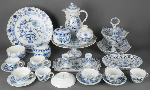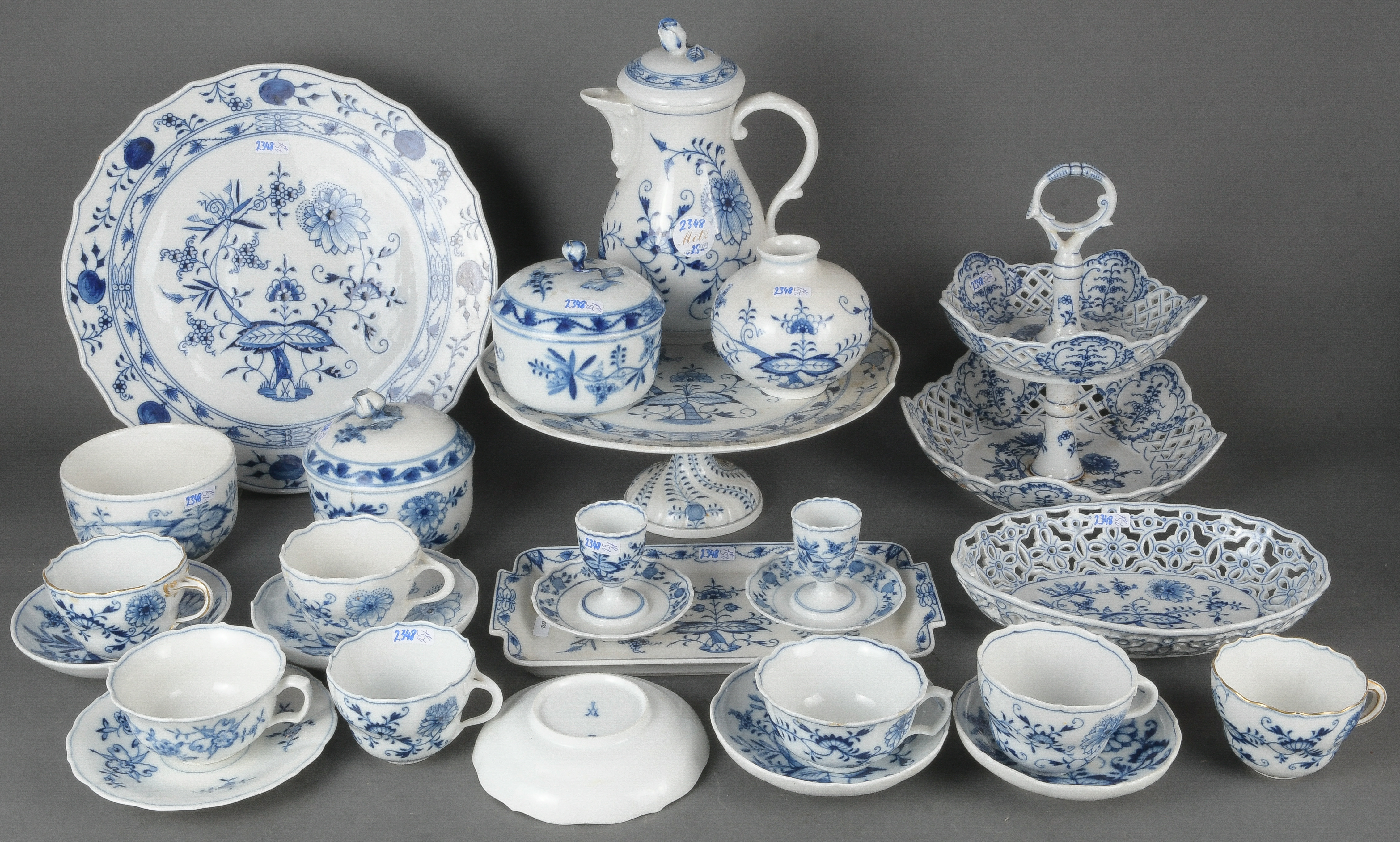 - Katalog-Nr: 234825-tlgs. Kaffeeservice „Zwiebelmuster“. Meissen 19./20. Jh. Porzellan, unterglasurblau bemalt, teilw. mit Goldrand; am Boden unterglasurblaue Schwertermarke, teilw. mit einem bzw. zwei Schleifstrichen. Bestehend aus: Eine Kaffeekanne (H=23 cm), zwei Zuckerdosen (H=je 13 cm), 13 Tassen mit zehn Unterschalen, eine Vase (H=11 cm), ein Kuchentablett (H=2,5 cm, D=32 cm), eine rechteckige Kuchenplatte (H=2,5 cm, B=29 cm, T=15 cm), eine Durchbruchsétagère (H=24 cm, D=24 cm), zwei Eierbecher (H=je 7 cm), ein Tafelaufsatz (H=13 cm, D=30 cm), eine ovale Durchbruchsschale (H=4,5 cm, B=24 cm, T=17 cm) und eine Schale (H=7,5 cm, D=11,5 cm). (besch.)o.L.