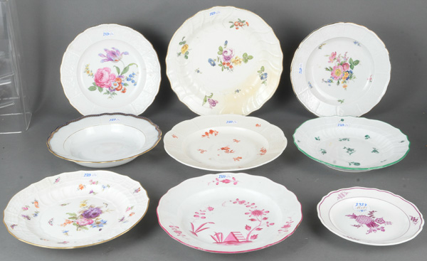 - Katalog-Nr: 2327Neuntlgs. Konvolut Meissen 19./20. Jh. Porzellan, bunt bemalt mit Blumen und Insekten, Goldrand; verso unterglasurblaue Schwertermarke, teilw. mit einem oder zwei Schleifstrichen. Bestehend aus: Fünf Speiseteller (D=22,5 bis 25 cm), zwei Suppenteller (D=je 23,5 cm), ein Beilageteller (D=18 cm), eine Schale (D=26,5 cm). (einer best. / einer rest.)o.L.