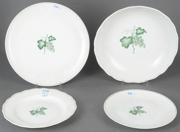 - Katalog-Nr: 2328Viertlgs. Konvolut. Meissen 20. Jh. Porzellan, bemalt mit Trauben und Weinblättern; am Boden unterglasurblaue Schwertermarke, drei Schleifstriche. Bestehend aus: Ein Speiseteller (D=25,5 cm), zwei Beilageteller (D=20,5 cm) und eine Schale (D=25 cm).o.L.