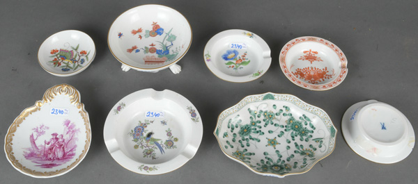 - Katalog-Nr: 2340Achttlgs. Konvolut Meissen 19./20. Jh. Porzellan, bunt bemalt mit indianischer Blume, Kakiemon, Vogeldekor und Watteauszene; am Boden unterglasurblaue Schwertermarke, teilw. mit einem Schleifstrich. Bestehend aus: Vier Aschenbecher (D=9,5 bis 12 cm), eine Fußschale (H=5,5 cm, D=11,5 cm), eine Löffelschale (H=2,5 cm, B=20,5 cm, T=13 cm), ine kleine Schale (D=8 cm) und eine ovale Schale (H=3,5 cm, B=15 cm, T=11,5 cm). (zwei Teile best.)o.L.